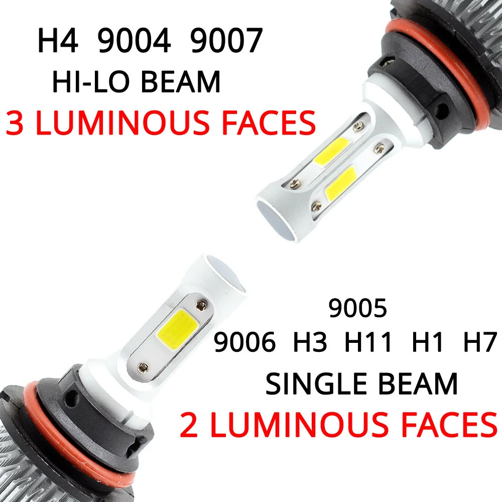 H1/H3/H7/H11/9005/9006/9007/9012 are single beam,2 luminous faces(360 degree),2pcs Bridgelux COB chips