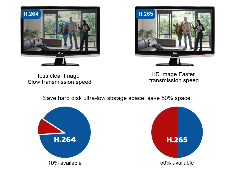 H.265 более четкий, HD разрешение предлагает вам лучшее качество изображения в более низкой скорости. Экономьте больше места для хранения, вы можете уменьшить размер файлов 40%-50%, сэкономить место для хранения HDD и снизить стоимость покупки.