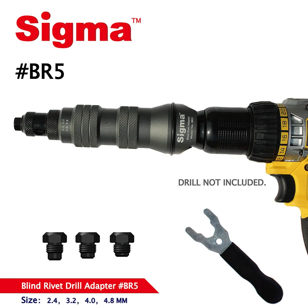 СигмаТМ# BR5 изготовлен из одной обработанной с ЧПУ твердой алюминиевой заготовки и имеет Прочные подшипники. Легко преобразует вашу беспроводную, пневматическую или проводную дрель в клепальную машину. Комплект включает в себя элементы и работает на слепых заклепках