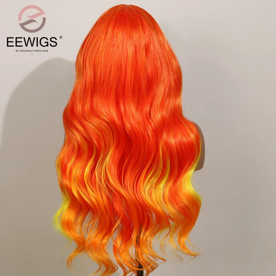 EEWIGS Высокая температура волокна волос 24 "длинные волнистые оранжевый желтый синтетический парик фронта шнурка средняя часть Омбре парики для черных женщин