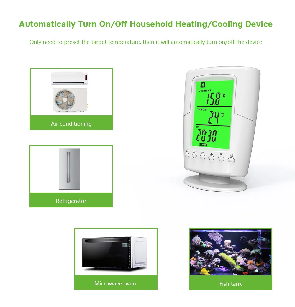 Интеллектуальные Программируемые Беспроводной термостатИспользуется для контроля нагрева или охлаждения устройств для поддержания стабильной и комфортной комнатной температуры. Вам нужно только установить заданную температуру, затем он автоматически включится или выключит ваше домашнее электрическое Отопление/охлаждающие устройства.