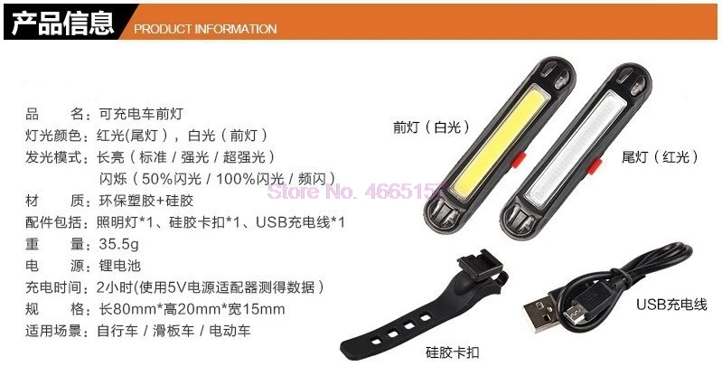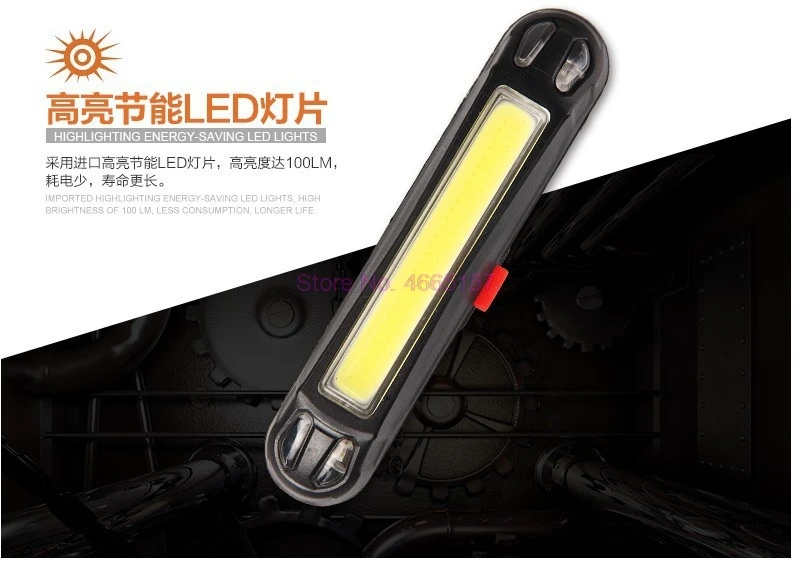 Характеристика: 1. Яркий энергосберегающий светодиодный светильник, высокая яркость до 100 лм, меньшее энергопотребление, более длительный срок службы. 2. Usb-интерфейс для зарядки, автоматическая полная мощность, Высококачественная литиевая батарея, зарядка всего 1-2 часа, устойчивая длинная яркость 5 часов. 3. Супер Водонепроницаемая производительность, также может использоваться как обычно в дождь, не повредит свет, так что езда в дождливую ночь безопаснее. Спецификация: Цвет: как на картинке Материал: пластик + силикон Размер: 80x20x15 мм Время зарядки: 2 часа Батарея: литиевая батарея