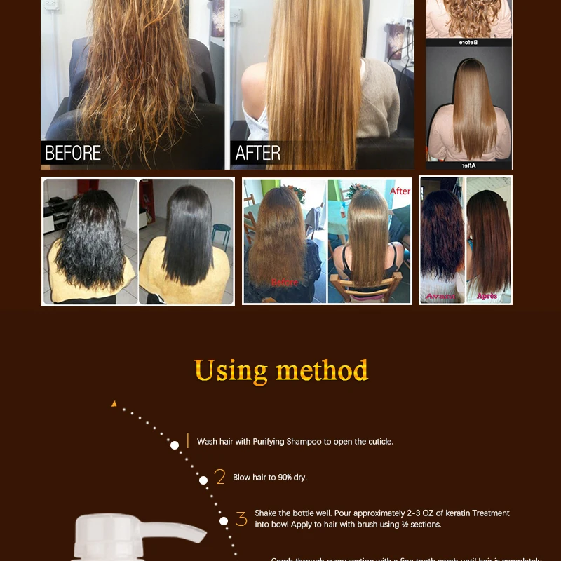 Примечание:Если у вас золотистые волосы, пожалуйста, не выбирайте кератин без формальдегида, или ваши волосы станут оранжевыми. Выберите кератин с 5% формалина или другой.