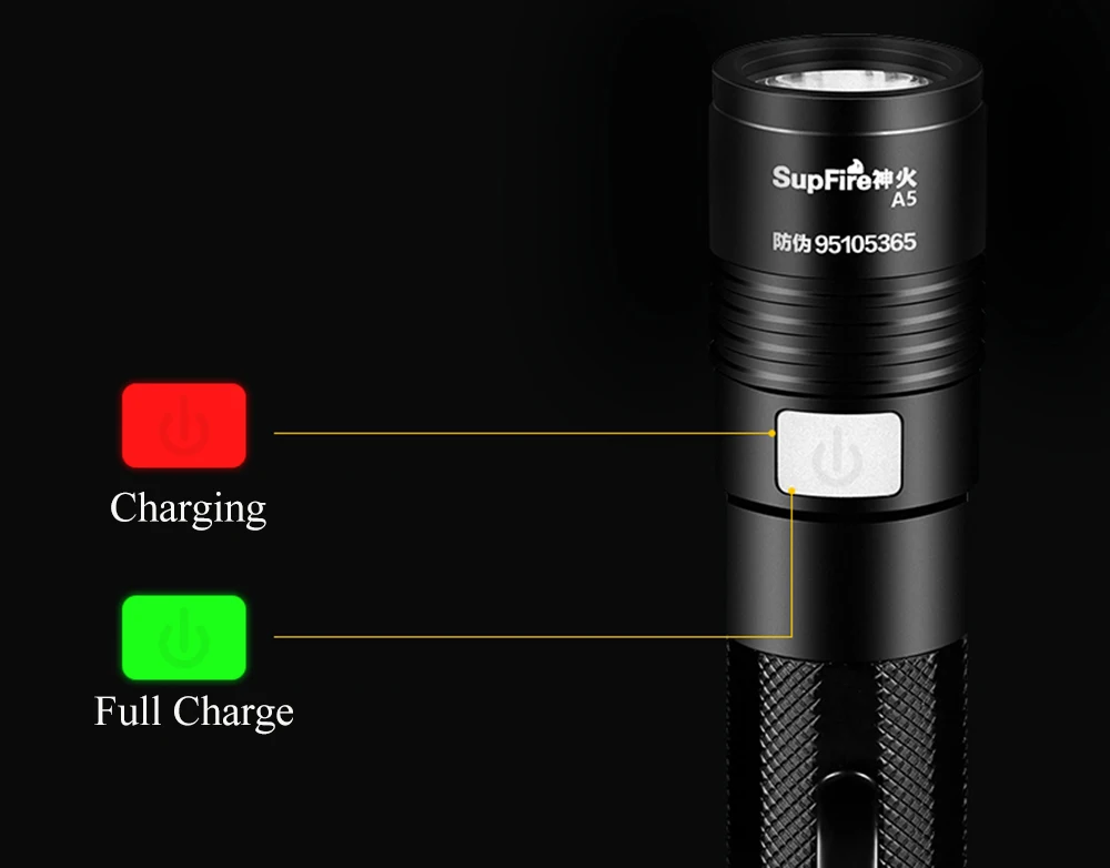 Нажмите на средний переключатель для включения или выключения Нажмите Средний переключатель, чтобы выбрать режим 1. Один щелчок для настройки одного режима. Циклы от High-Medium-Low-Strobe-SOS. 2. Нажмите 2 секунды, чтобы выключить 3. Используйте usb-кабель для зарядки для подключения фонарика. 4. При зарядке светильник переключателя красного цвета, это означает зарядку, светильник переключателя зеленого цвета, это означает полную зарядку.