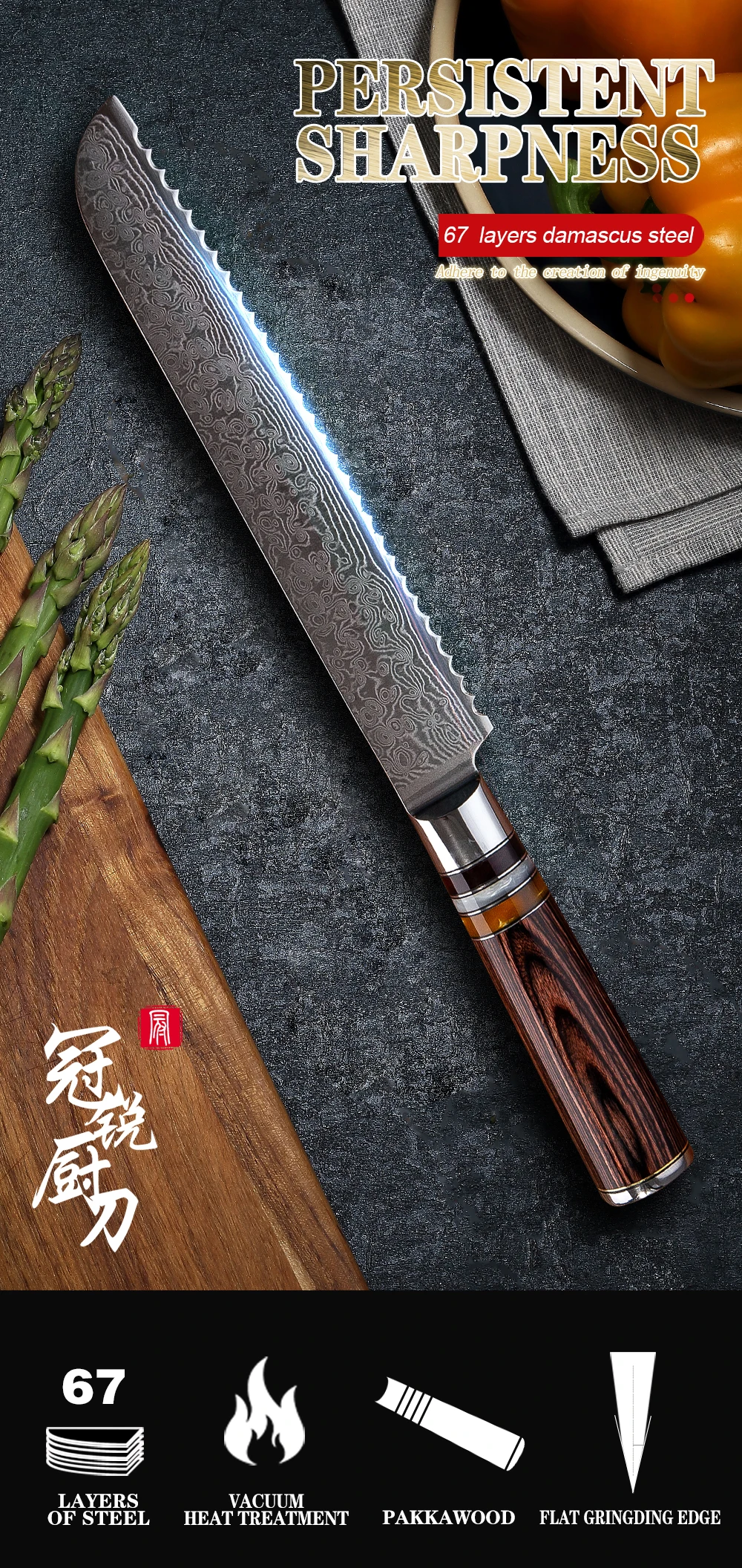 Изготовлен из 67-слой дамасской Сталь импортируется из Японии. VG-10 стальной режущий сердечник;