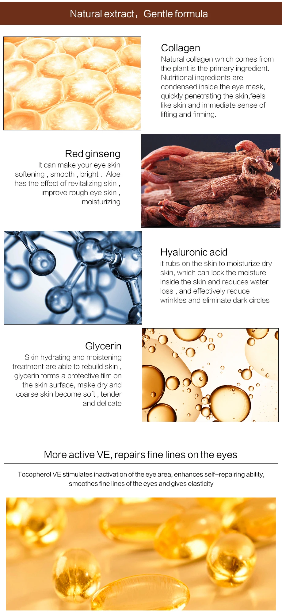 Инновационный увлажняющий глаза формула обслуживания, пополняет воду, восстанавливает глаза, полный коллагеновой маски, помогает облегчить текстуру глаз, улучшает тусклый мягкий глаз, нежный и изысканный текстуры, глаз больше поглощения, питательные вещества и защита от влаги, увлажняют и питают ваши глаза, приносят вам сияющие глаза молодости.