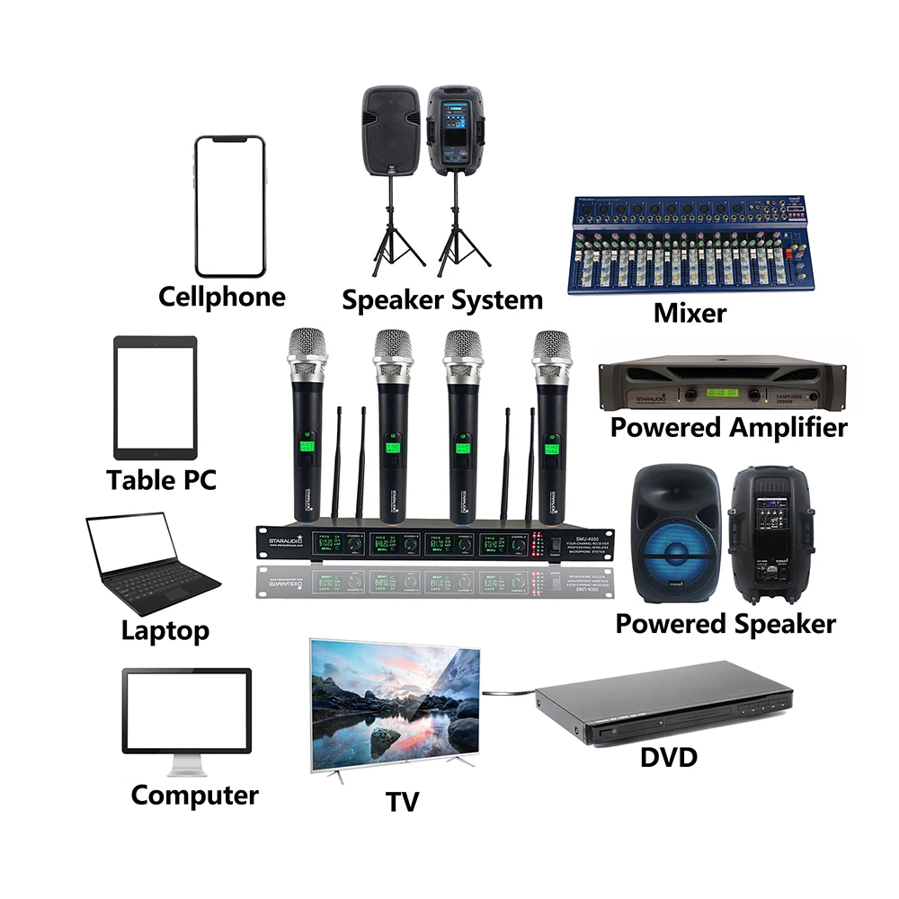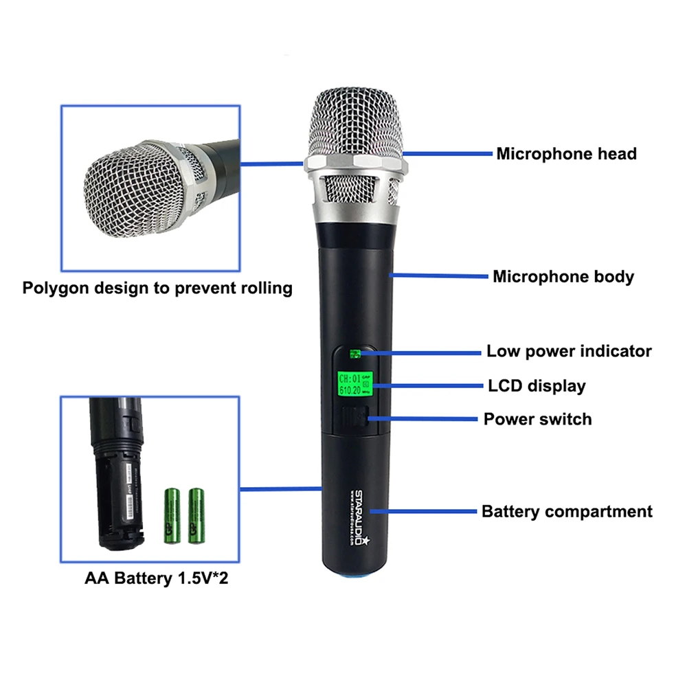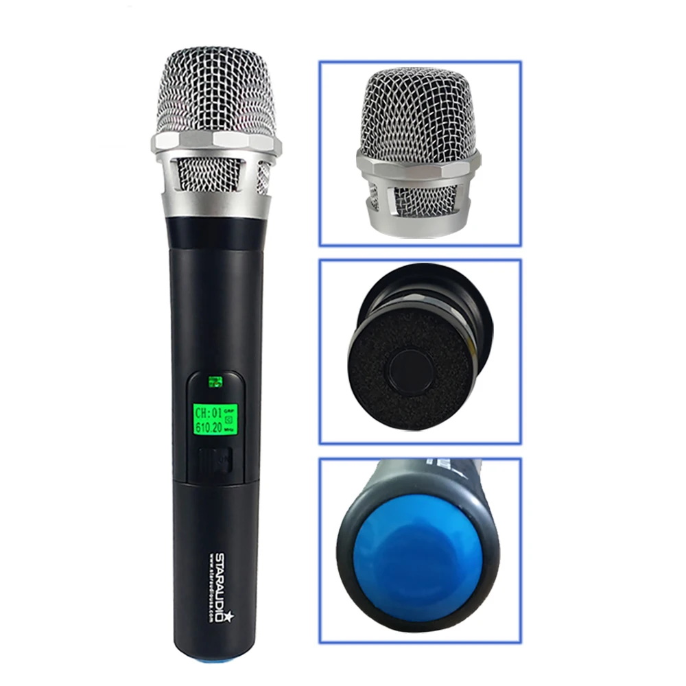 Беспроводной микрофон, включая информацию о неавтоматическом выборе, полученную на концерте с моделями потока, и информацию об автоматическом выборе, полученную на профессиональной сцене с роскошными моделями. Его популярные модели изготовлены из кварцевого фиксированного частотного приемника, устраняющего волны среди «мертвых» явлений, чтобы устранить прерывистые или нестабильные недостатки аудиовыхода приемника. Основаны на функции «Блокировка шума», чтобы избежать помех от переключателя в режиме ожидания и открыть учетную запись. Огромный импульсный шум. Аудиовыход со сбалансированным и смешанным, может соответствовать различным входным характеристикам усилителя.