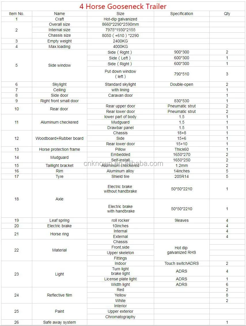 Описание прицепа лошади гусиная шеяИзвестный Конный прицеп-это специальное транспортное средство для конного спорта. Он оснащен вентиляционным и вентиляционным устройством, противоскользящим полом, чехлом и защитным мягким мешком, и может быть установлен с кондиционером, резервуаром для воды, навесом от солнца и беспроводной системой видео мониторинга в соответствии с потребностями клиентов, чтобы обеспечить безопасную и комфортную транспортную среду для лошадей.