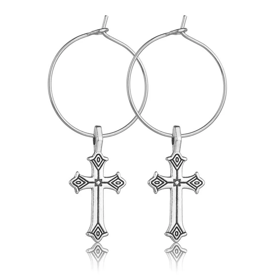 Женские массивные большие сережки с особенным крестиком серебристого цвета, классические длинные серьги в сдержанном стиле