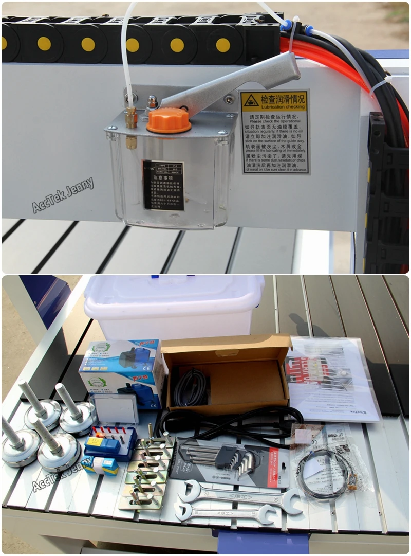 5) Аксессуары: регулируемая ножка, водяной насос, зажимы для Т-образного слота, 1 набор режущих бит, 4 шт коллеты, гаечные ключи, запасной ограничительный переключатель, кабели и руководство пользователя и т. Д.