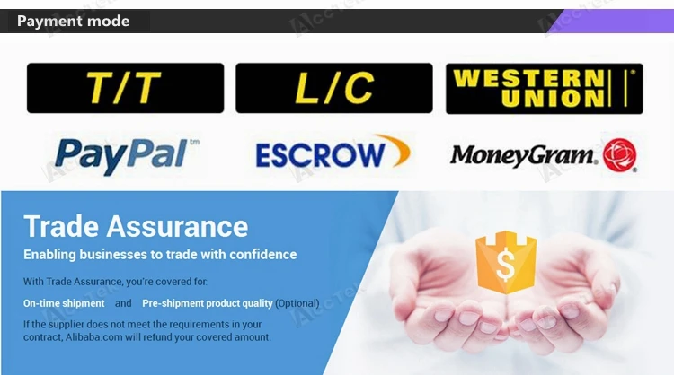 Мы принимаем TT, Paypal, Western Union, Moneygram, Alibaba trade assurance. Вы можете оплатить 30% заранее, затем закончить 70% перед поставкой.