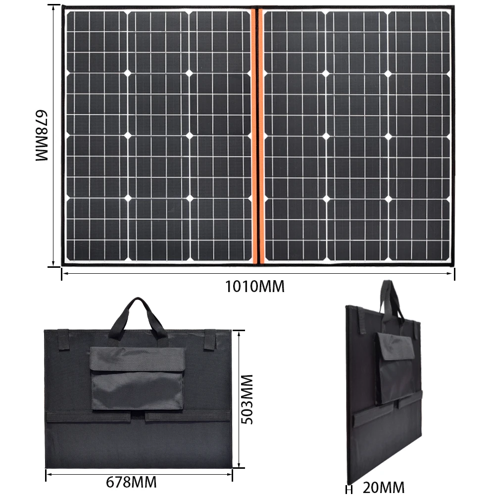 1. Тип ячейки: монокристаллический 2. Рабочее напряжение: 18 в Напряжение разомкнутой цепи: 21,6 в 3. Мощность: 110 Вт; 4. Максимальный рабочий ток: 6,11a Ток короткого замыкания: 6,72a 5. Рабочая температура: -20 ℃ ~ + 60 ℃; 6. Размер: складной: 668x503x20 мм Разворачивается: 1010x678x4 мм; 7. Вес: 3100 г; 8. Платье свободного покроя, карман с 0,5 м SAE соединительный кабель с разъемом кабеля;