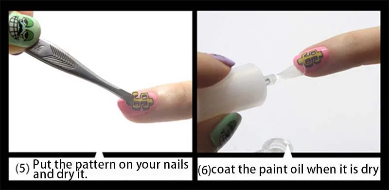 1. Обрезать, очистить и полировать ногти; Покрасить задний фон на ногтях и высушить его. 2. Снимите пленку продукта, Вырежьте похлопыватель и погрузите ее в воду 10-20 секунд. 3. Смочите ногти, приклейте Паттер в положение. 4. Промойте воду бумажным полотенцем и высушите. 5. Крышка с прозрачным лаком для ногтей и высушить.