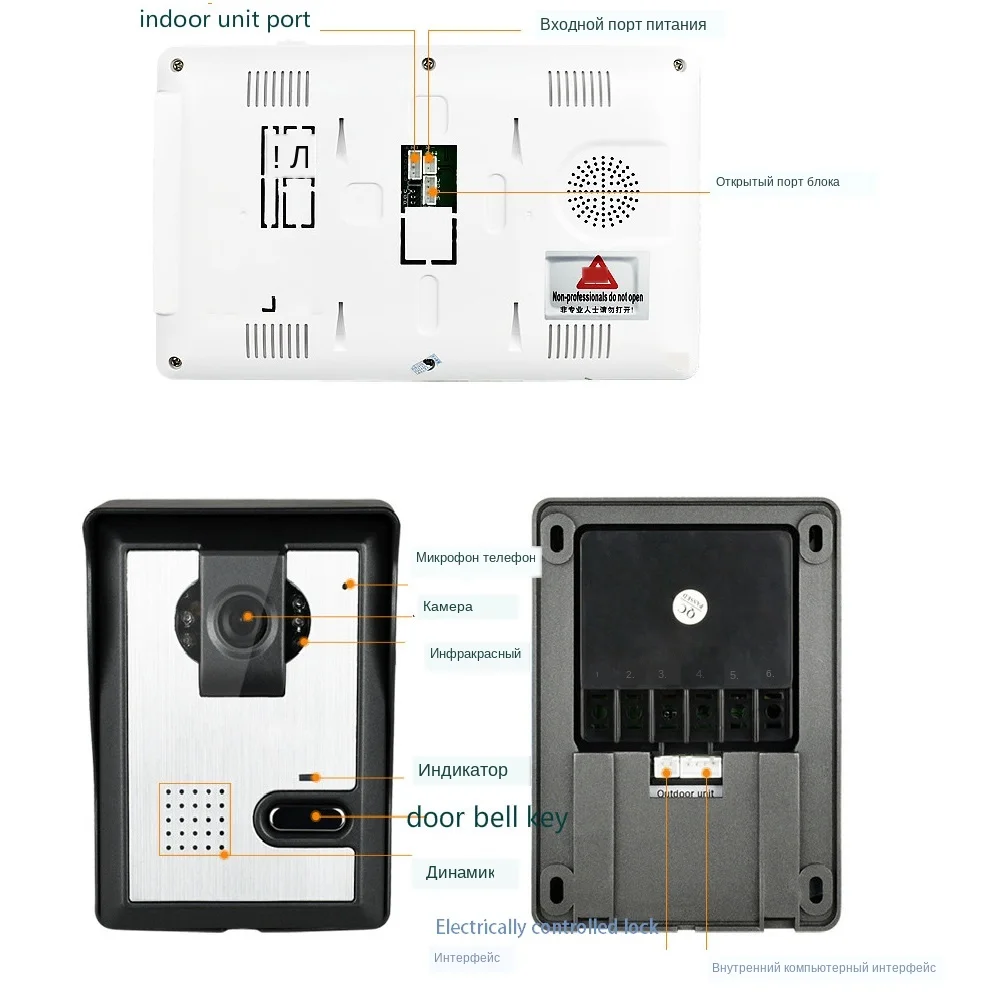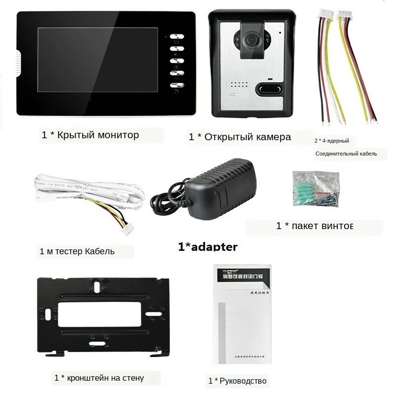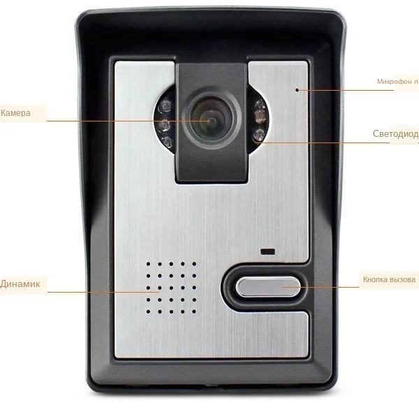 1,7 "цветной TFT lcd. Нет излучения, низкое энергопотребление. 2. Нестандартные светодиоды для ночного видения, более удобные. 3. Непромокаемый дизайн, антиоксидантный открытый блок с фортепиано печет лаковой панелью. 4. Виды колец для выбора. 5. Фортепиано печет лаковые панели дизайна на крытом блоке, более модно и роскошно. 6. Hands free домофон, одна кнопка касания делает идеальный опыт. 7. Поддерживает максимум 1 Наружный блок с 4 внутренними блоками 8. Встроенный ИК-фильтр обеспечивает улучшенное качество изображения и цвета Технические характеристики: 1. Экран: 7 "TFT 2. Разрешение: 800*600 3. Камера: 1/3 "HD 1000 ТВ линия 4. Объектив камеры: 3,6 мм 5. Угол обзора камеры: 92 градуса (регулируется) 6. Инфракрасный светодиодный: 6 шт. 7. Расстояние инфракрасного освещения Приблизительное: 2 метра 8 время работы монитора: 60 секунд 9. Энергопотребление: статическое состояние <0,5 Вт, вызов <10 Вт
