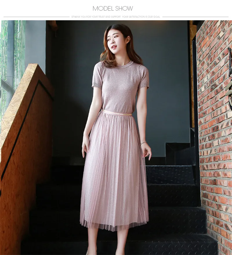 Серебряный Блестящий люрекс, вязаный женский комплект из двух предметов, футболка с круглым вырезом и короткими рукавами + сетчатая юбка с высокой талией