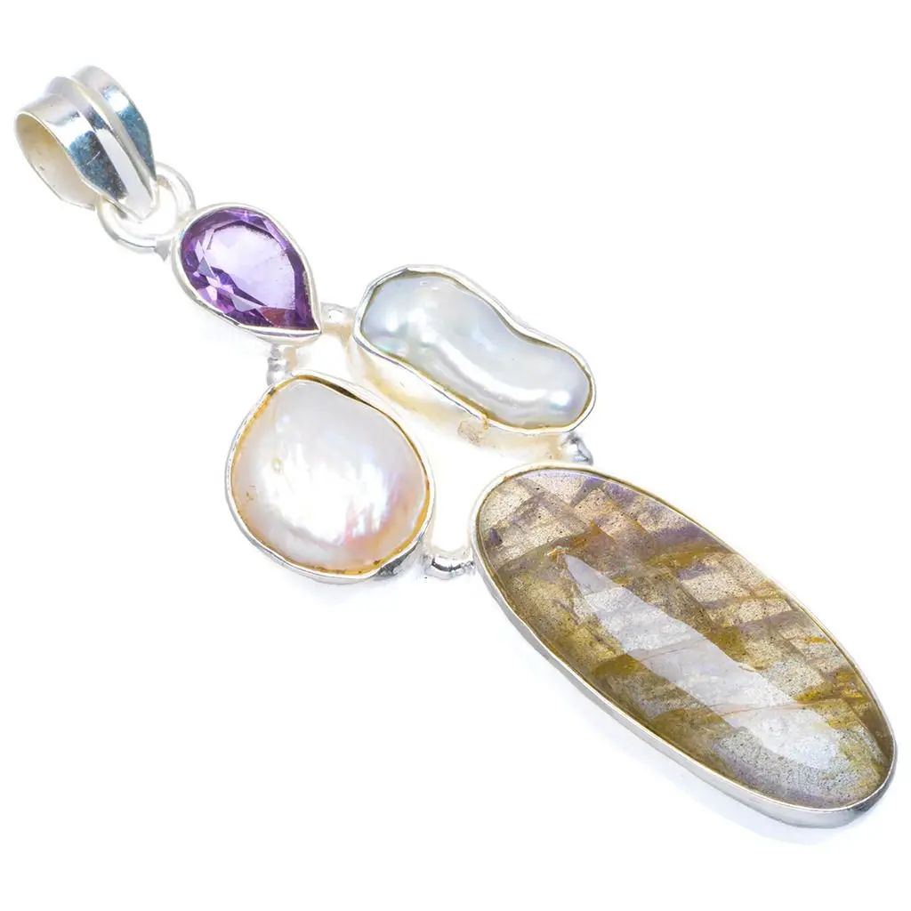 Натуральный голубой огненный лабрадорит, бива жемчуг и аметист уникальный 925 пробы серебряный кулон 2,5 " ; A4865