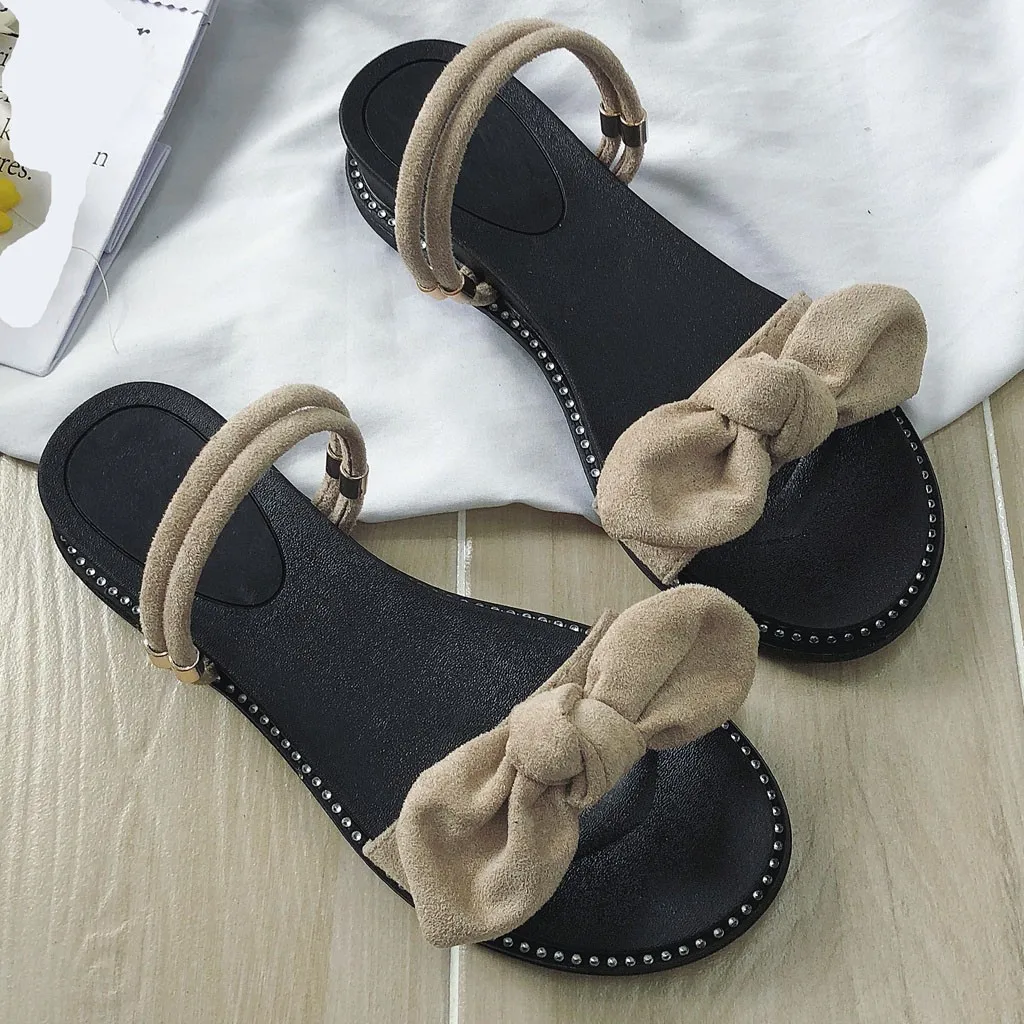 Женские летние замшевые пляжные шлепанцы с бантом в римском стиле, сандалии на плоской подошве с открытым носком