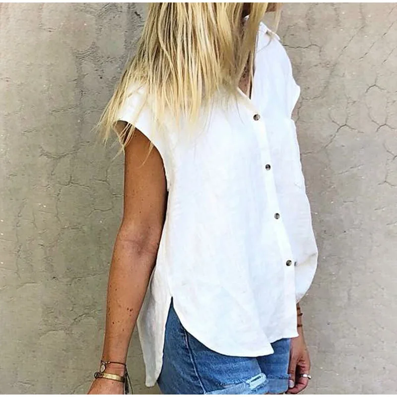 Белая рубашка с отложным воротником и коротким рукавом, Женская свободная Однотонная рубашка на пуговицах, Женские повседневные блузки на весну и лето 2019