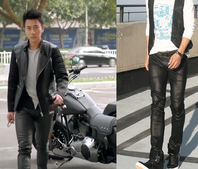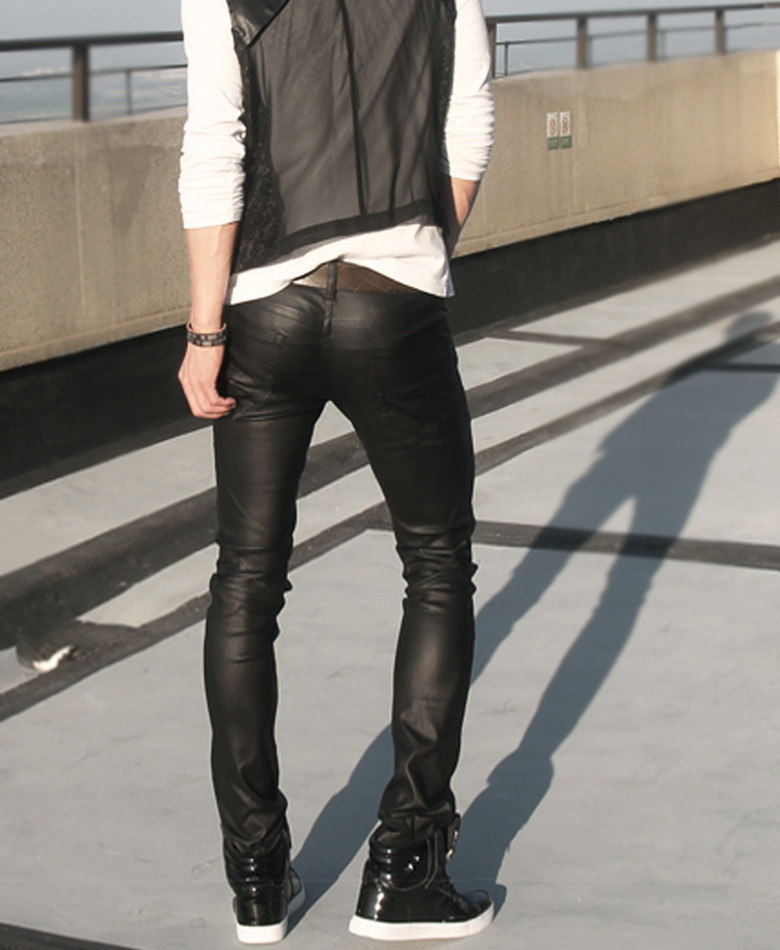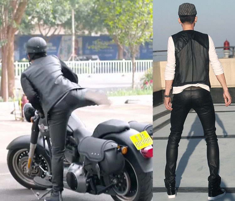 Мужские облегающие брюки блестящие Стрейчевые в байкерском стиле черные костюм