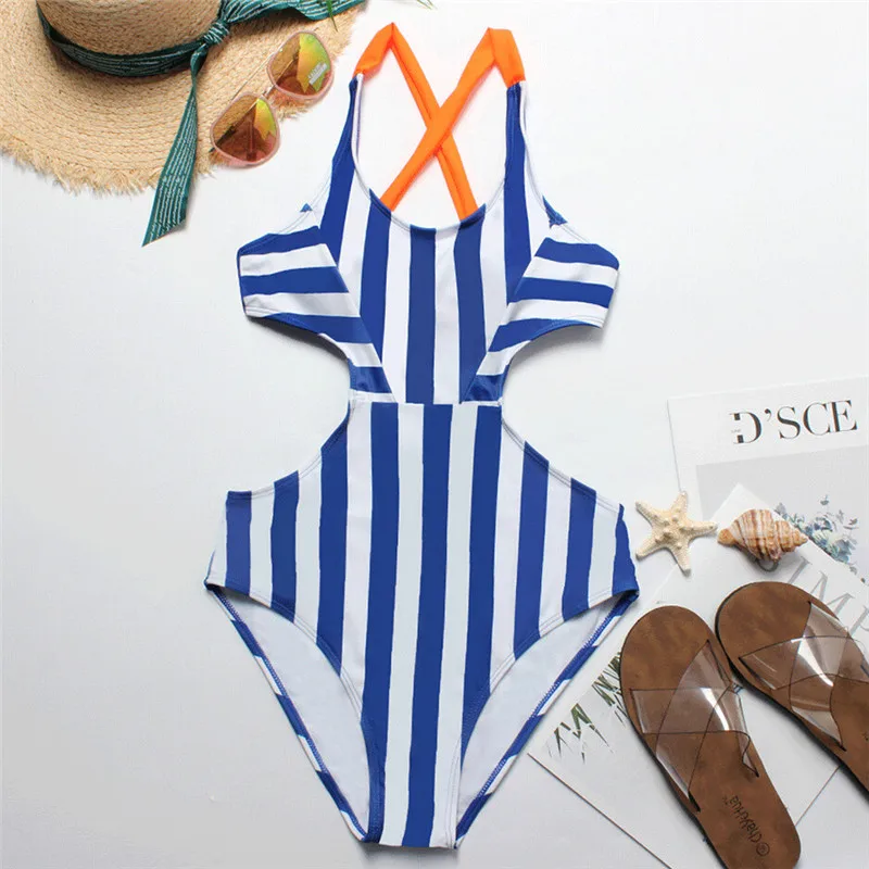 Женский слитный купальник без рукавов с открытой спиной, пляжная одежда в бело-синюю полоску, купальник пуш-ап, монокини, бикини, купальный костюм, 2019