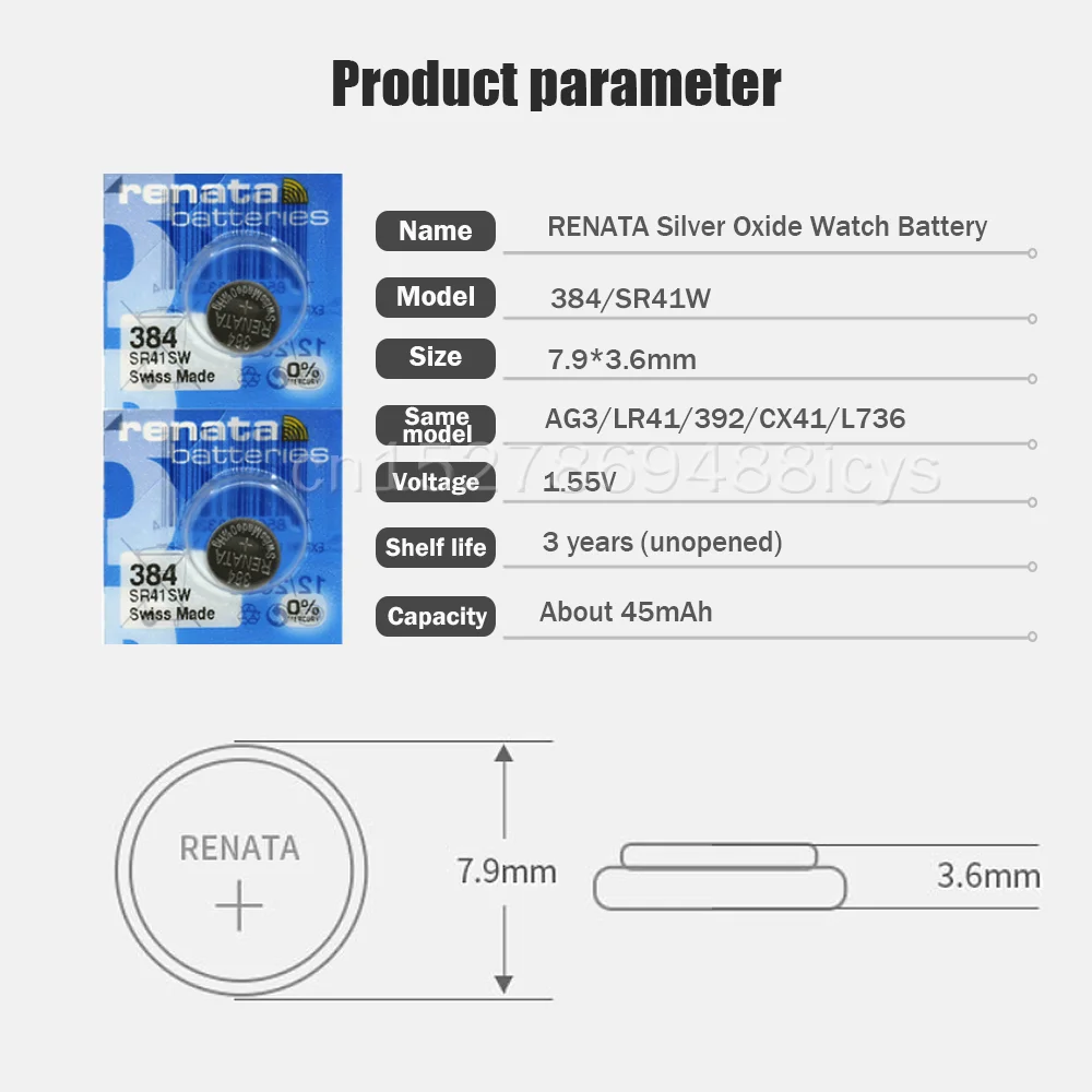 10 шт./лот, Renata 384, 100% оригинал, абсолютно новые часы с оксидом серебра, батарея, долговечная, SR41SW, швейцарская кнопка, батарейки для монет, действительны в течение 3 лет