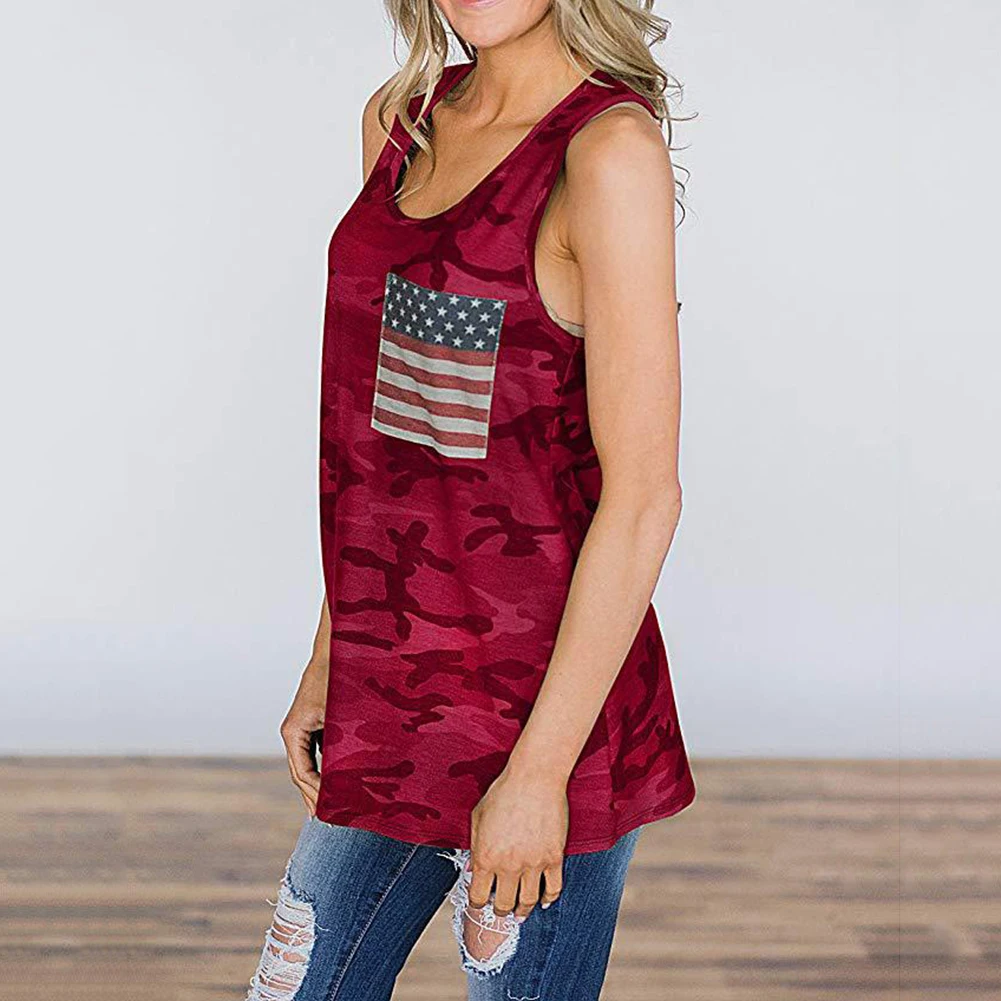 Женский Повседневный Камуфляжный Топ, свободный Камуфляжный топ с накладным карманом и американским флагом на лето, 2019