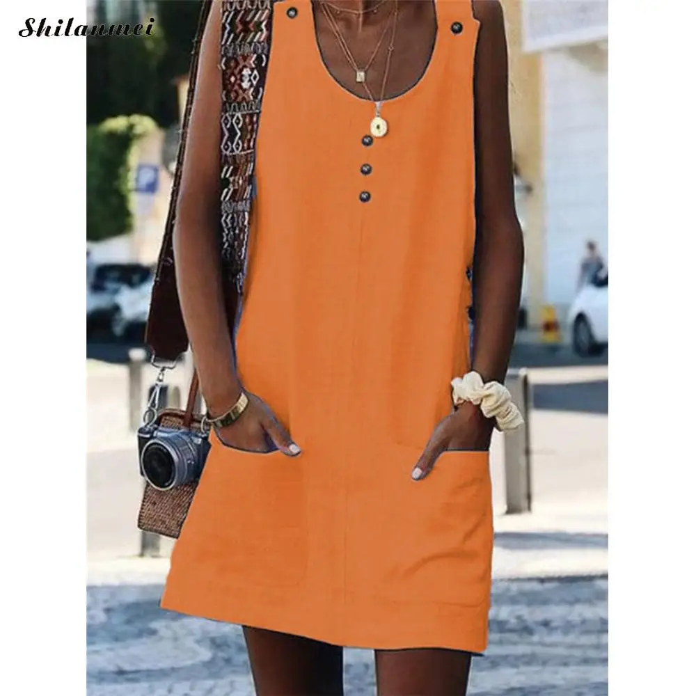 Женское летнее хлопковое платье на пуговицах без рукавов, пляжный сарафан в стиле бохо с карманами, свободная повседневная футболка, женское платье