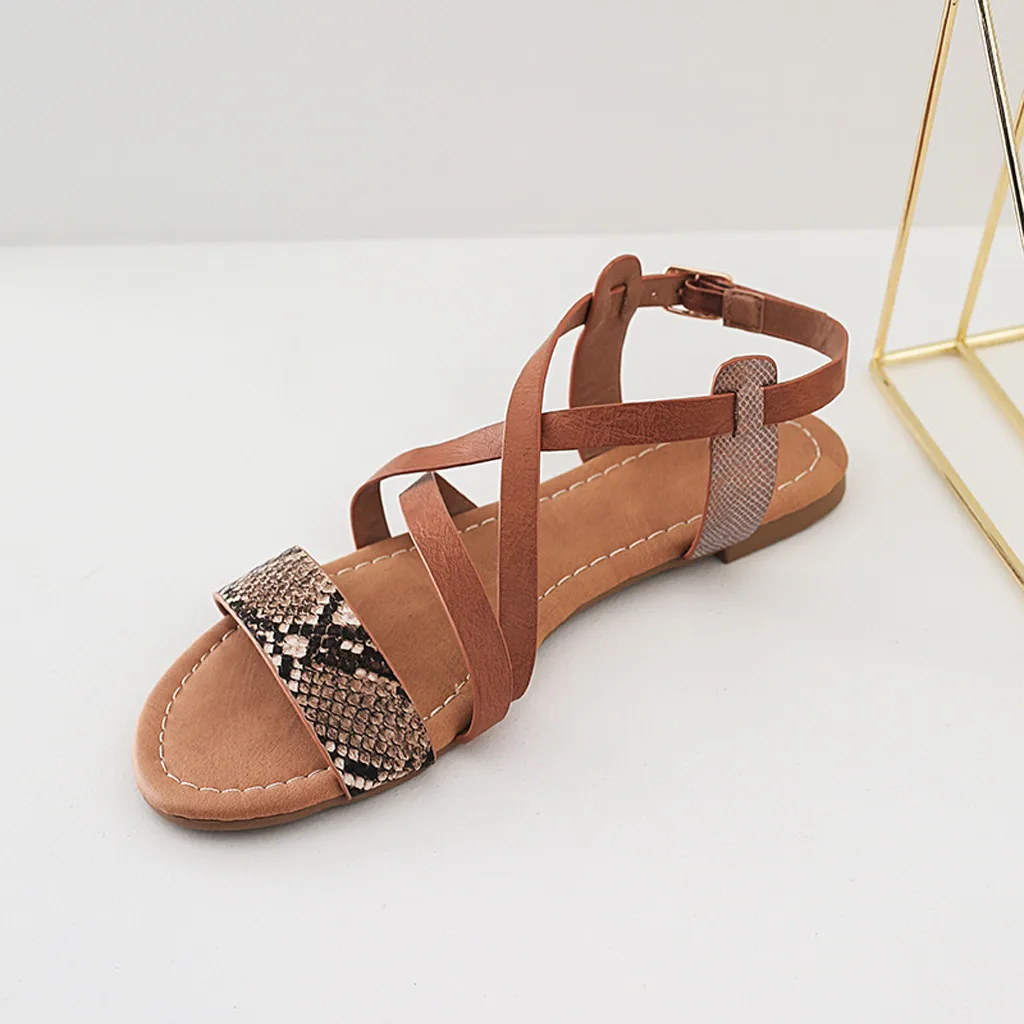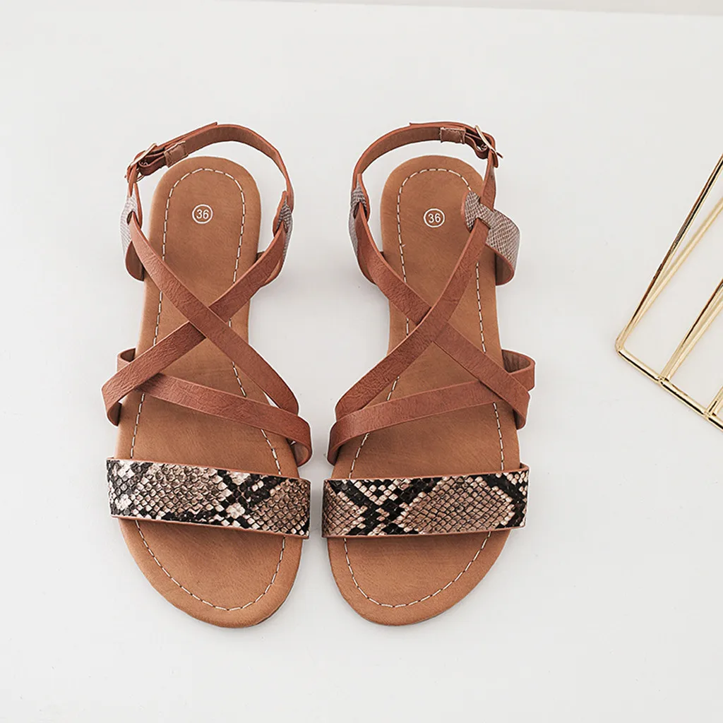 Женские модные туфли на плоской подошве из змеиной кожи; женские римские сандалии с открытым носком и перекрестными ремешками