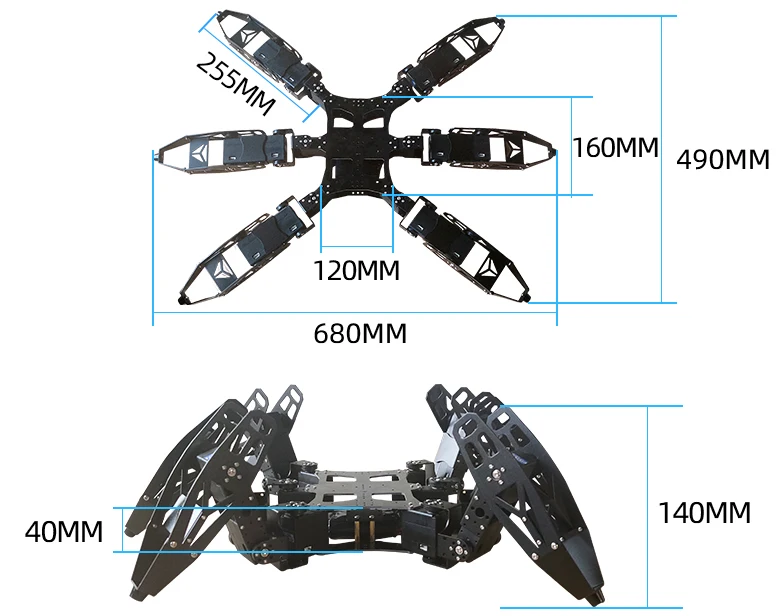 -Материал из алюминиевого сплава, высокая прочность-Запасное отверстие для переключателя и контроллера-18DOF, может закончить вперед, назад, поворот, танцы, зажимные движения и т. Д.-Не включает сервопривод, сервоконтроллер, питание2..Таблица размеров: