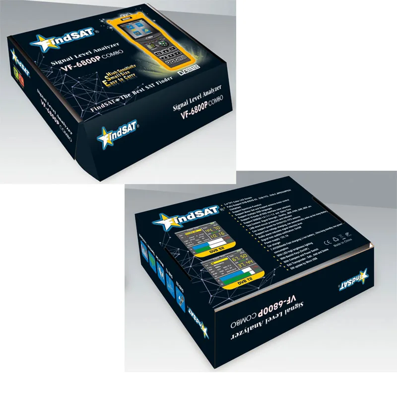 1.2.4 * TFT цветной ЖК-экран 2. Полная поддержка DVB-S/DVB-S2,DVB-T/T2,DVB-C/C2,MPEG2/MPEG4 совместимый 3. Поддержка спектра Funcion 4. Поддержка набора мотора и поддержка управления мотором антенны 5. Языки OSD: английский, арабский, польский, русский, испанский, португальский 6. Поддержка 10 видов выбора цвета интерфейса OSD 7. Поддержка DISEQC1.0/1,1/1,2, 0/22 кГц тон 8. Содержание теста; Сила сигнала. Качество. BER,PWR.SNR.MER. И т. Д. 9.LNB защита от короткого замыкания и индикатор 10.VF-6800P поддерживает питание для антенны 0 В/5 В/12 в T/T2 (временно не поддерживает 24 В) 11. Поддерживает низковольтную зарядку, может автоматически пробуждать спящий аккумулятор 12. Звуковой сигнал показывает уровень интенсивности сигнала 13. Звуковое уведомление блокировки сигнала; ВКЛ/ВЫКЛ 14. Мощность питания: 12v.1A 15. Автомобильное зарядное устройство 16.7.4 в/2000 мАч Быстрая зарядка литий-ионная батарея. Сверхдлительный режим ожидания. Низкое энергопотребление 17. Светодиодный светильник высокой яркости 18. С подсветкой клавиш (вкл/выкл) 19. С компасом и выключателем питания 20. Редактировать транспондер: редактировать, добавлять и удалять 21. Обновление Sw через Micro USB