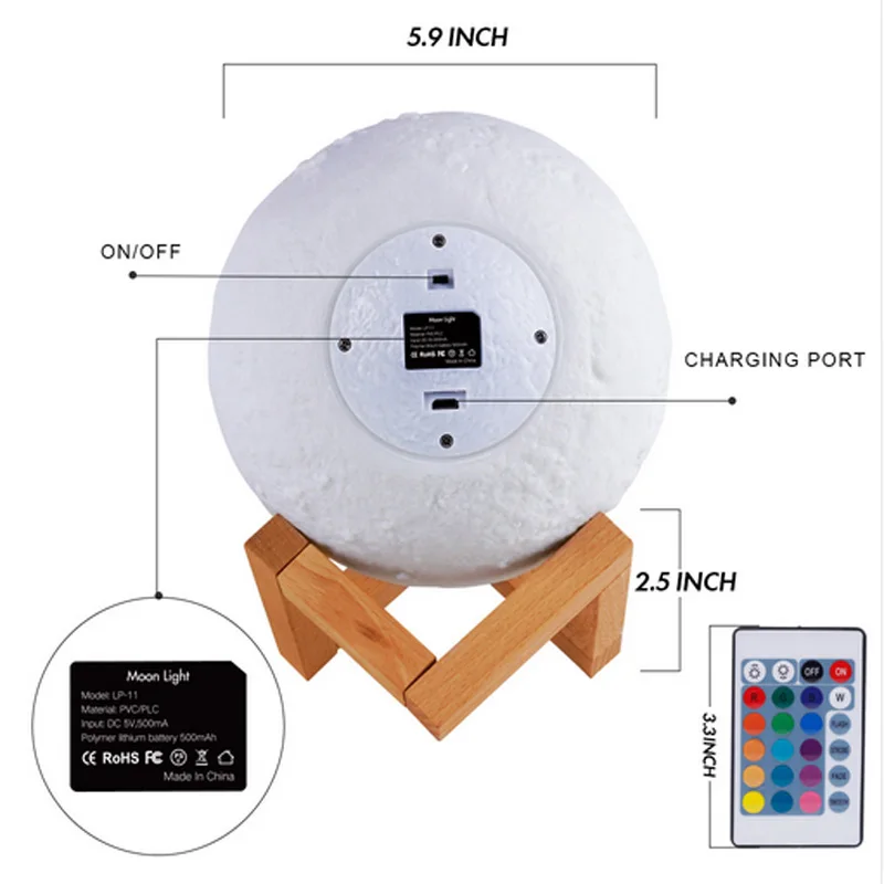 Wi-Fi светодиоды лунного света Размер продукта: diameter15CM Вес нетто: 262 г Вес брутто: 500 г Размер упаковки: 165*165*165 мм Размер коробки: 520*690*520 (мм) Общий вес: 20 кг/36 шт. Подключение Wi-Fi: однодиапазонный поддерживает сети 802,11 b/g/n (2,4-2,5 ГГц) Цвет света: теплый белый/цвет ful Материал корпуса: ПВХ/PLA Источник питания: 5 В постоянного тока, 1 А Мощность: 1 Вт В коробке: Лунная лампа * 1 usb-кабель для зарядки * 1 деревянное крепление * 1 Руководство пользователя * 1 Rgb + 24key светодиоды лунного света Dimmable 7 цветов и разноцветные модели: белый, теплый белый, красный, зеленый, оранжевый, розовый, синий. 10 классов яркости для регулировки. Режимы: от белого до теплого белого; розовый синий, фиолетовый, зеленый красный чередующийся Пульт дистанционного управления USB Перезаряжаемый и сенсорный переключатель: Луна перезаряжается и встроена в аккумулятор, что позволяет лампе дольше срока службы. Есть также Кнопка питания под нижней частью лампы Портативный 5,9 дюймов и окружающей среды умеренный размер (5,9 × 5,9 × 5,9 дюймов) достаточно, чтобы показать красоту Луны, положите его на держатель или руку. Экологический материал позволяет вам безопасную и здоровую лунную лампу.☺☺Пожалуйста: Удалите желтая бумага на подставке перед установкой, база предназначена для того, чтобы быть очень тугой, поэтому ее нужно вставить трудно и не один раз