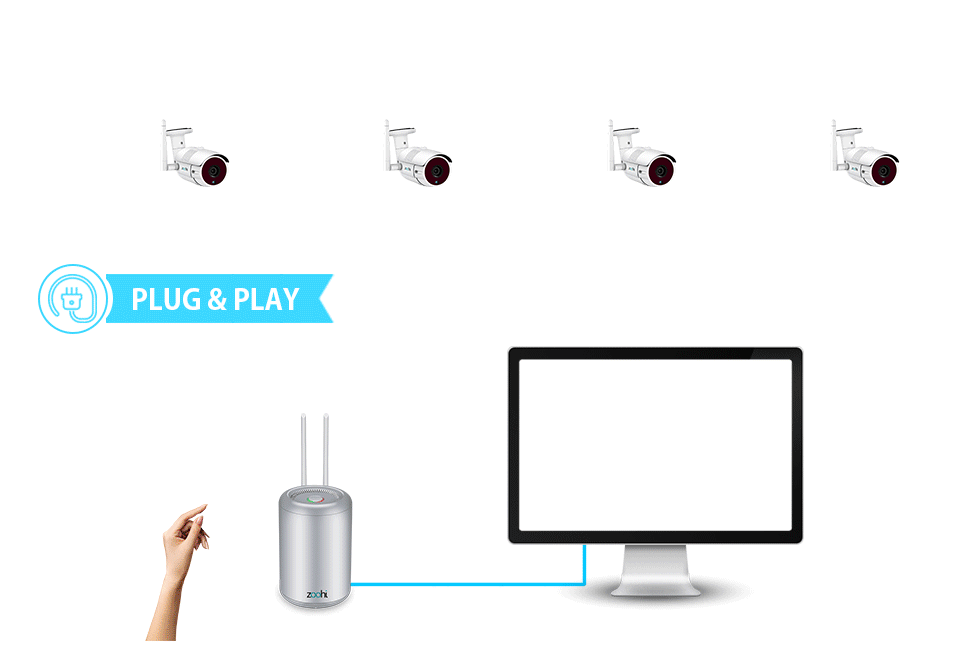 Система подключи и играй, ящик рекордера встроенный в маршрутизатор, все камеры wifi сигнал от видеорегистратора коробки, если Вы включите все камеры и рекордер, он будет работать должным образом.