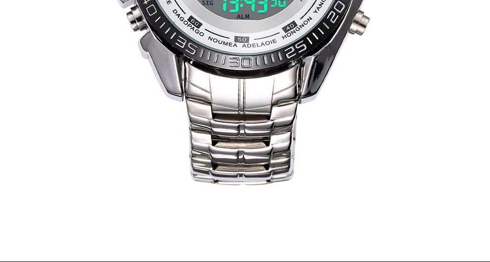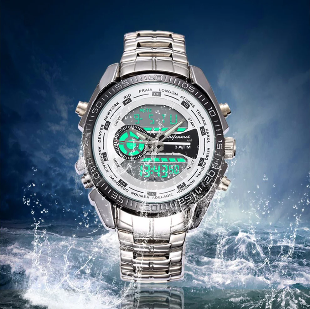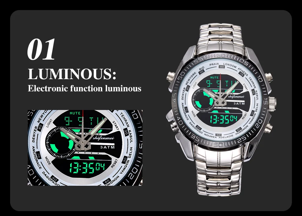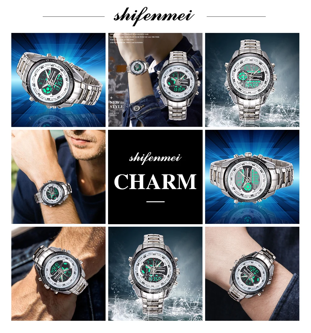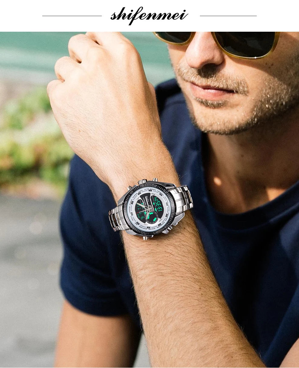 rand name : Shifenmei Movement: Quartz+Digital Mirror: Glass Case: Alloy Caseback: Stainless Steel Band: Stainless Steel Buckle: Stainless Steel Weight: 151g Case Size: 45mm Case Thickness: 15mm Band Size: 240*21mm W/P: 3 ATM