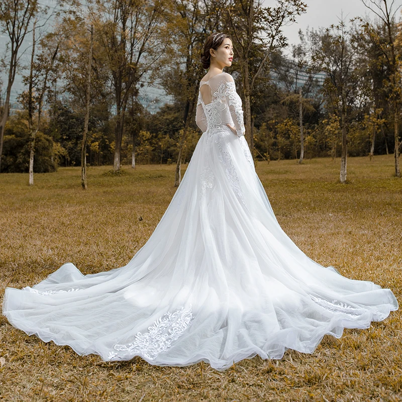 Свадебные платья с длинным рукавом J66624 janceber, трапециевидные свадебные платья принцессы с аппликацией сзади и шлейфом, 2019