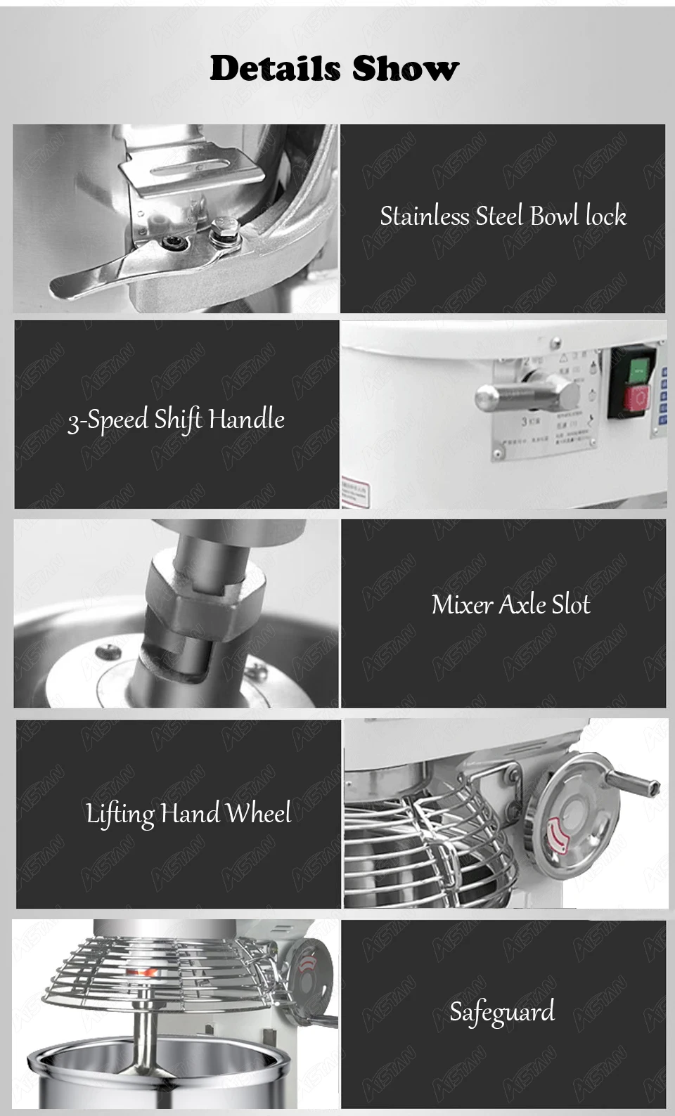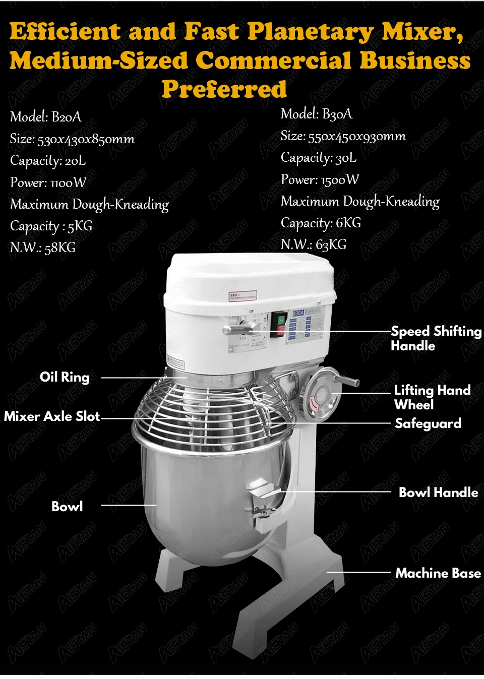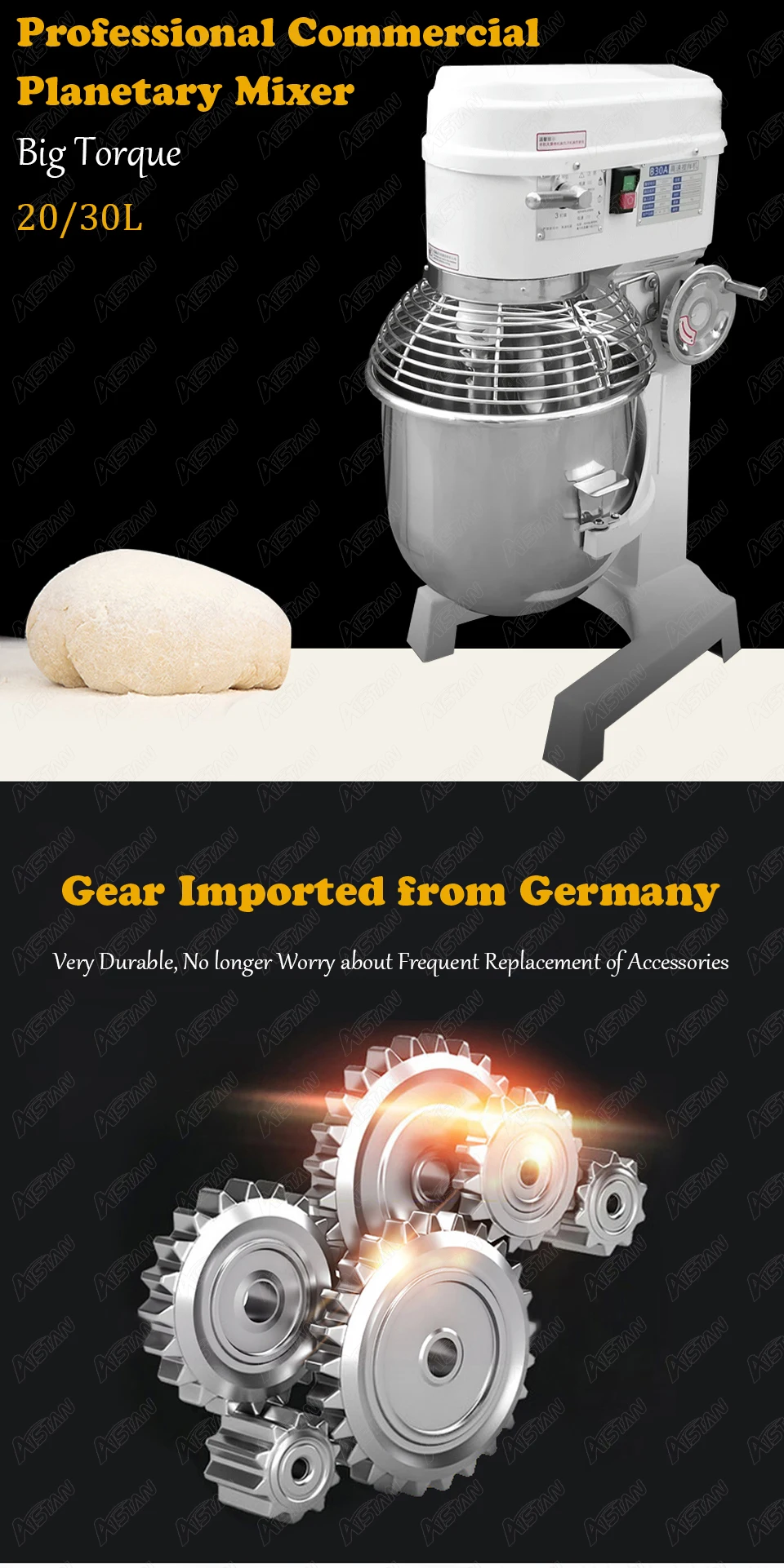 Электрический планетарный миксер Напряжение: 220 В или 110 В Мощность: 1100 Вт Размер: 530x430x850 мм Об/мин: 131/262 об/мин Объем: 20 л Вес нетто: 58 кг