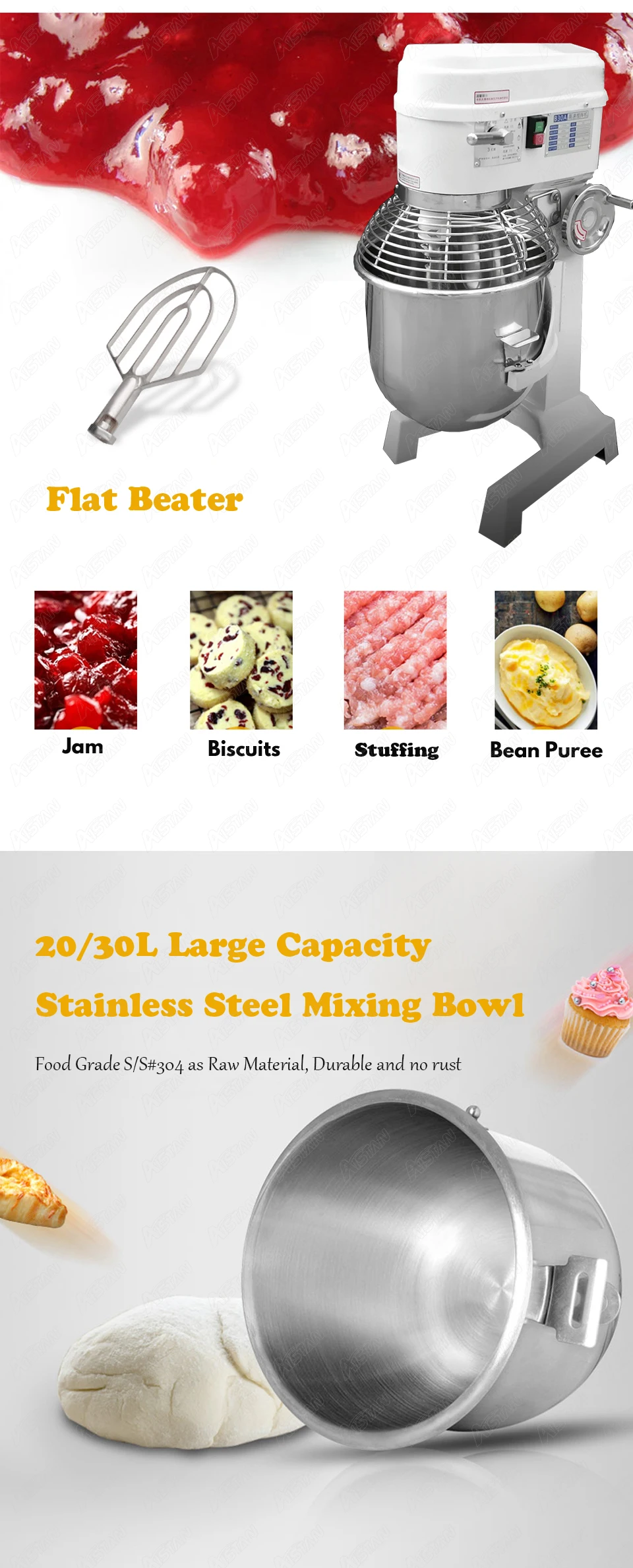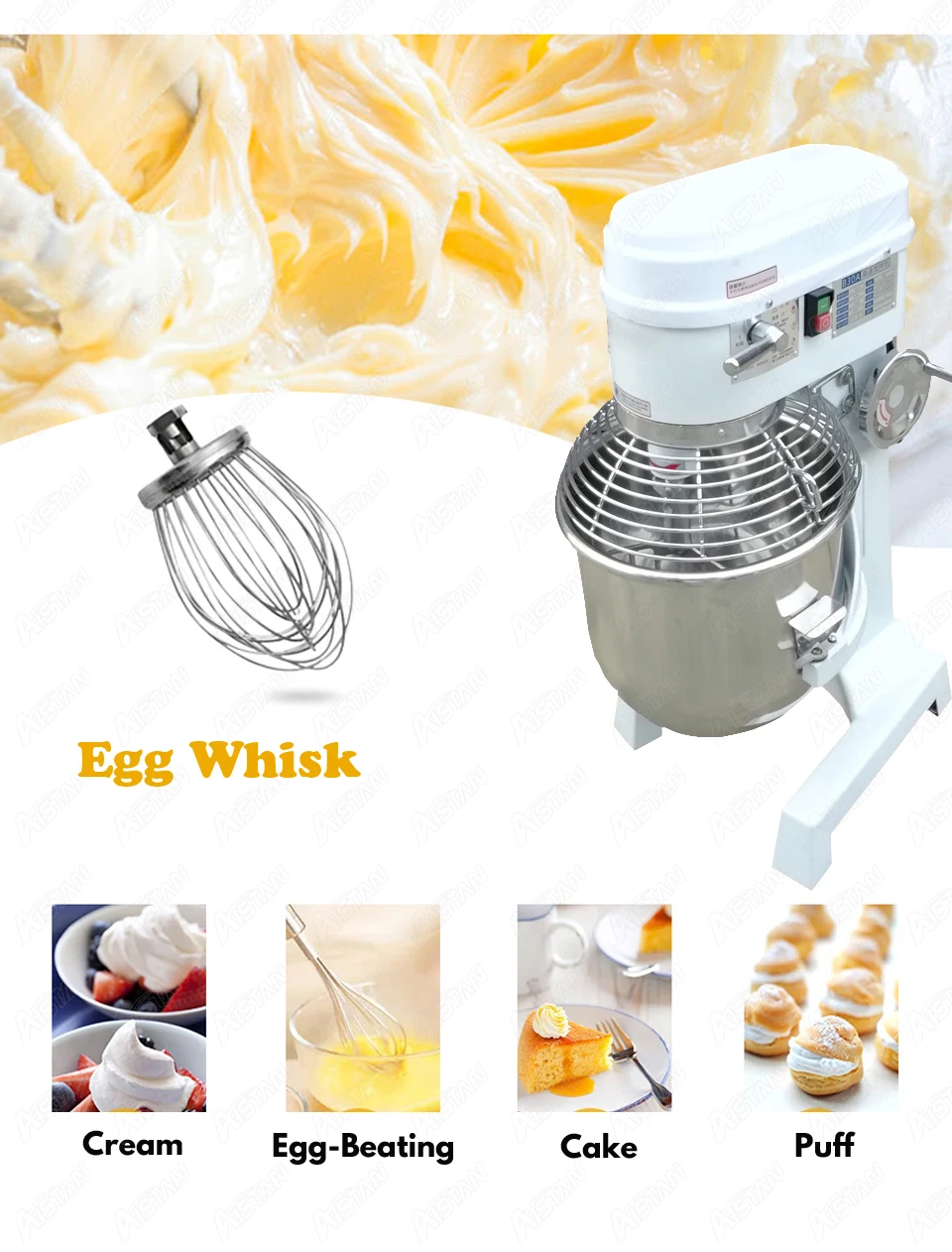 Электрический планетарный миксер Напряжение: 220 В или 110 В Мощность: 1500 Вт Размер: 550x450x930 мм Об/мин: 131/262 об/мин Объем: 30 л Вес нетто: 63 кг