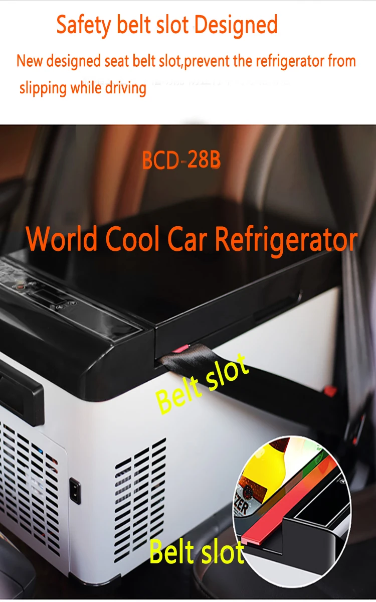 Дизайн, автомобильный холодильник может быть закреплен через пояс безопасности на ваше сиденье в автомобиле.
