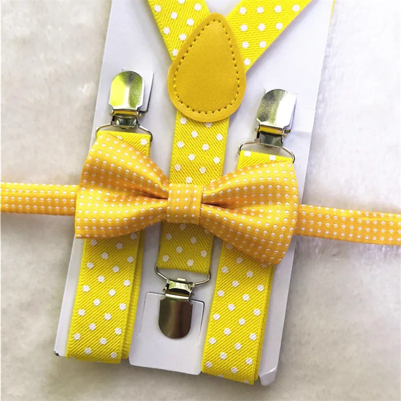 Design: kids yellow dots bow tie Suspenders set Packing: 1 set with opp bag Size: 2.5cm *65 cm