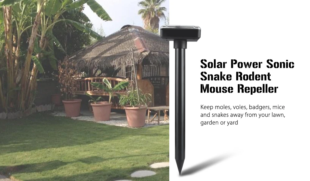ЭтоОтпугиватель змеи мышиИспользует безопасную звуковую технологию, чтобы избавиться от этих неприятных вредителей, мышей, крыс, волов и змей со своего двора, сада или фермы.ЭкспеллерОтправляет звуковую волну под землей, чтобы запугать животных в пределах 300 квадратных метров. В отличие от опасных химических спреев, убийц или ловушек, которые могут нанести вред вашим растениям и домашним животным.Отпугиватель звуковых волнЭто все естественно и физически, и заставляет крыс и змей покидать, не убивая их. Это означает, что не нужно забирать мертвых крыс или грызунов, и вам не придется беспокоиться о загрязнении или пищевом отравлении, например, какой химический метод может вызвать. КакОтпугивательРаботает на солнечной энергии, нет необходимости в проводке. Просто вставьте его в землю, и у вас есть защита поля.