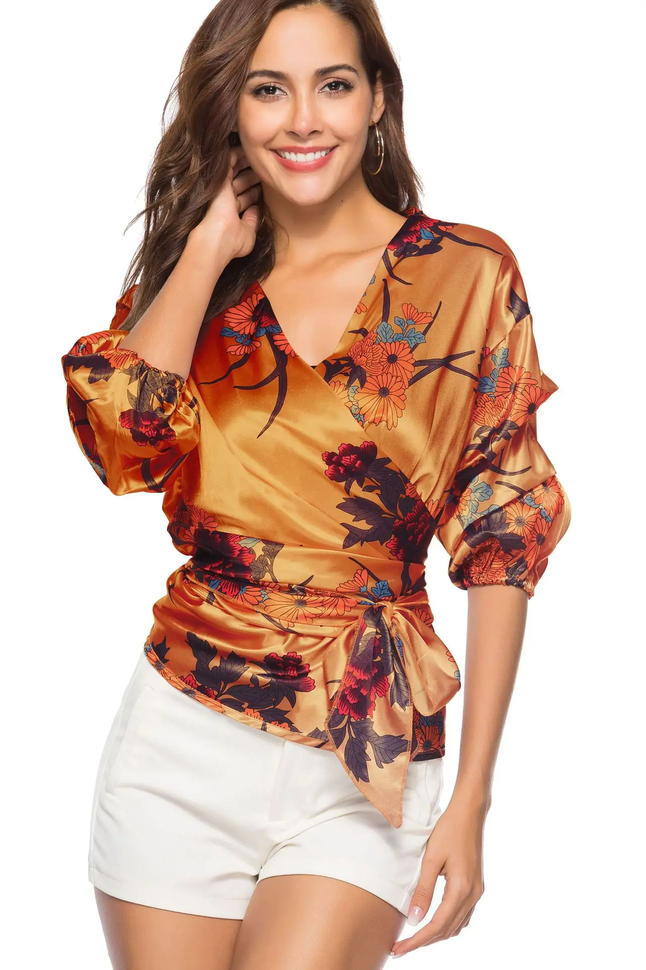 Ткань: верх: полиэстер футболка Особенности: цифровой цветочный принт, v-образный вырез, кардиган на бретельках с пятью точками, эластичные рукава, шифон, мягкий и элегантный Узор: принт (белый, розовый, желтый, зеленый, черный) Стиль: Повседневный, модный, для отдыха, для офиса, вечерние Упаковка: 1 * рубашка