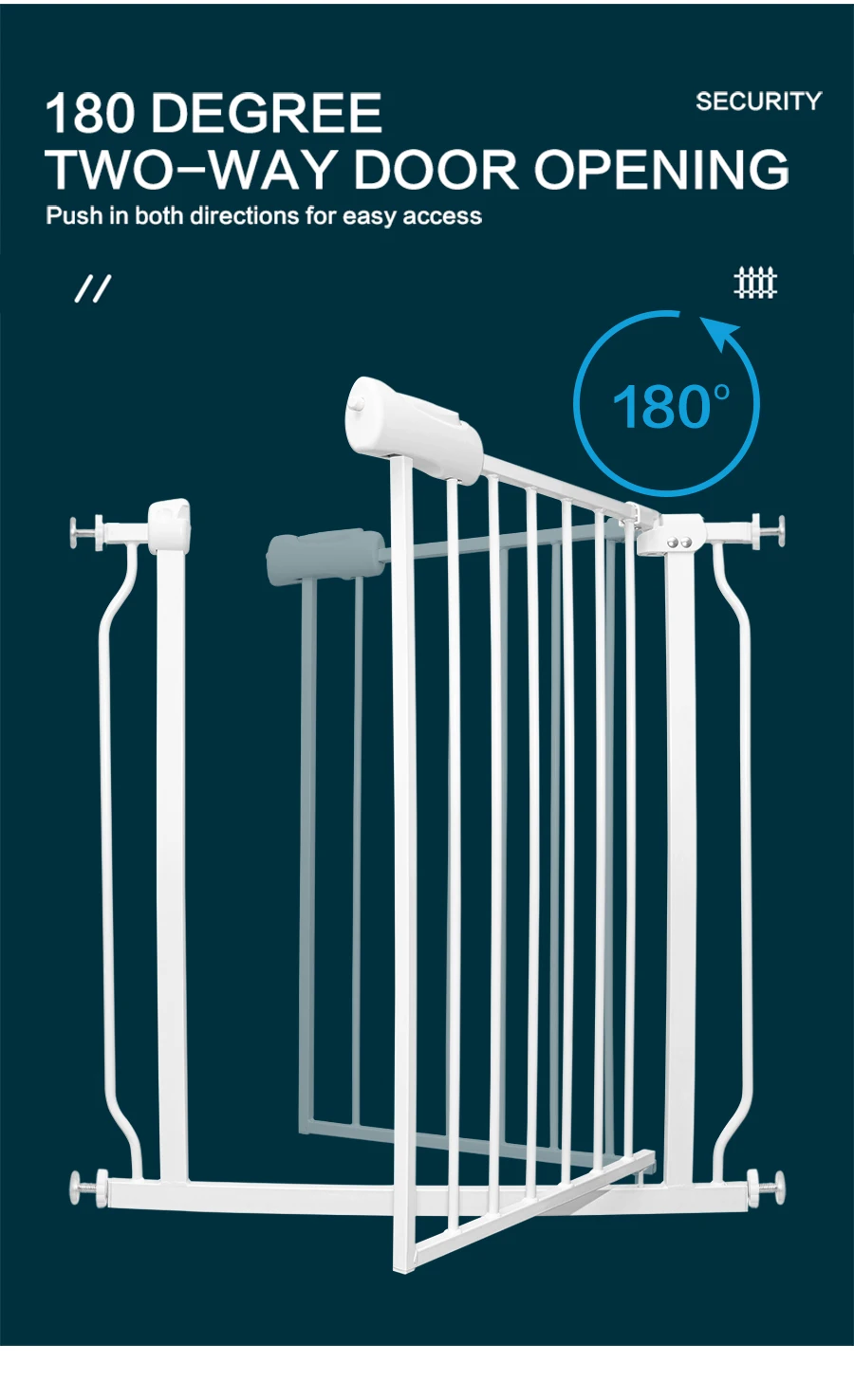 Extra wide gate opening designed with door swings conveniently in either direction for easy walk-through in or out.