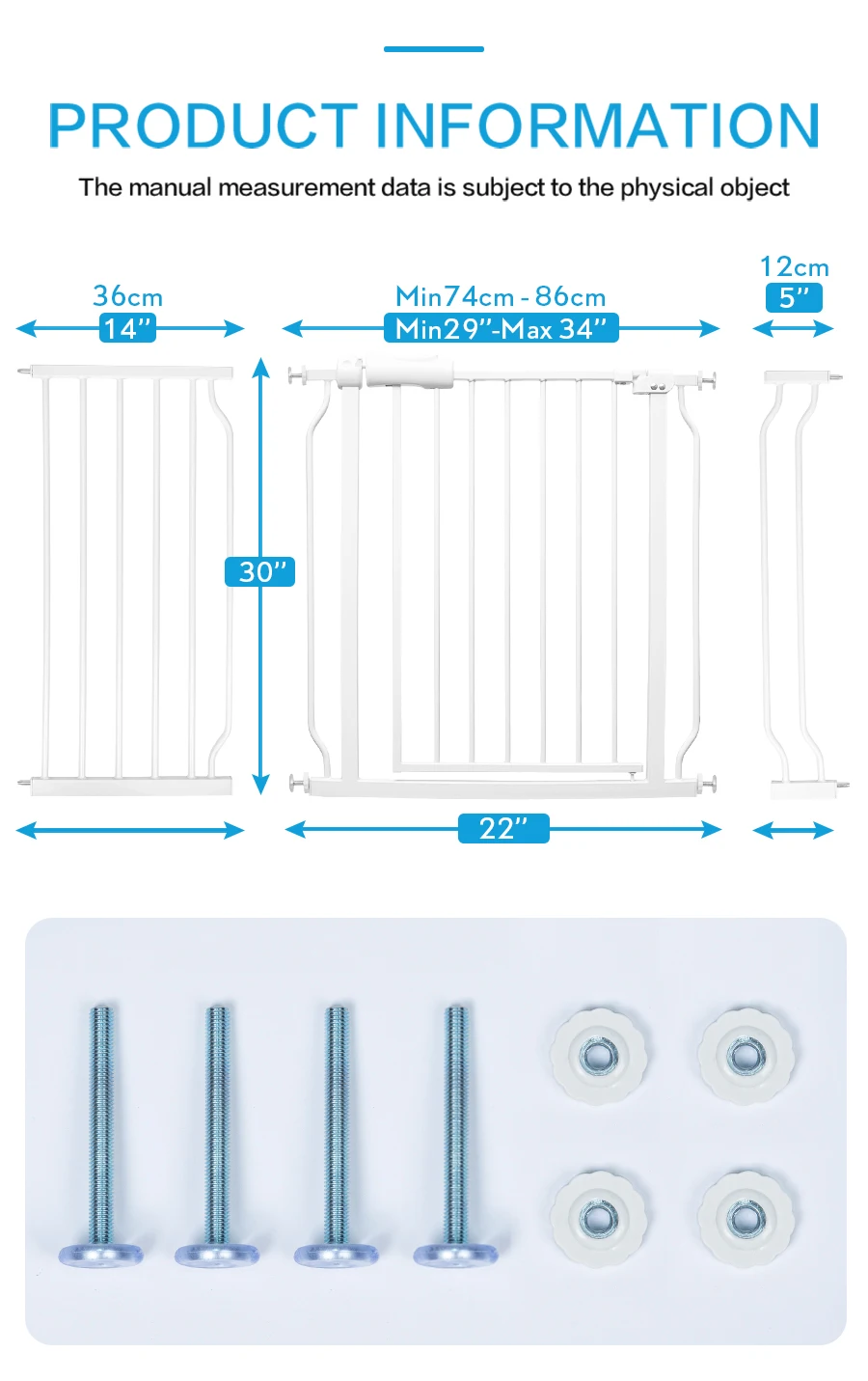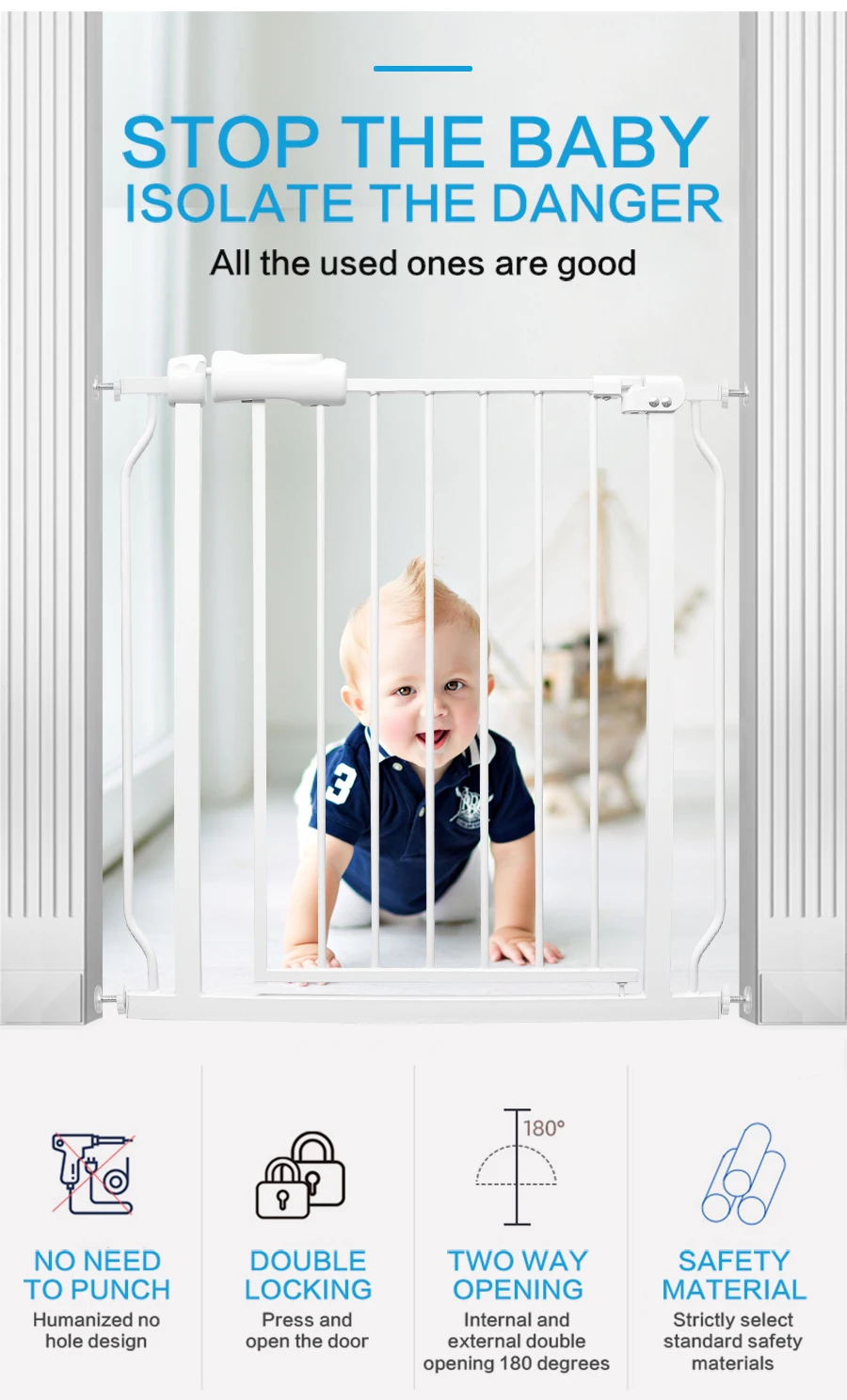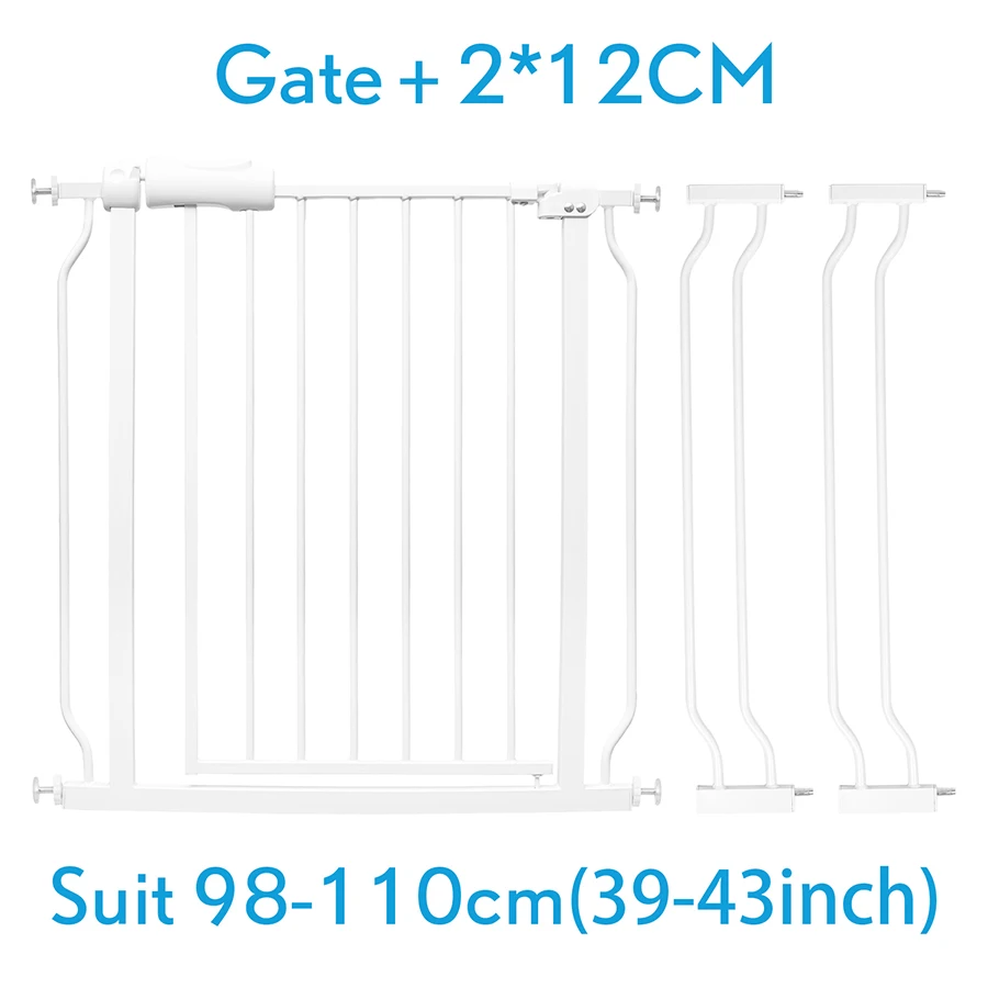 The baby gate designed with a one-touch release easy slide handle safety lock. A secure spring-loaded latch keeping gate safely closed when not in use. Easy one-handed open and close operation.