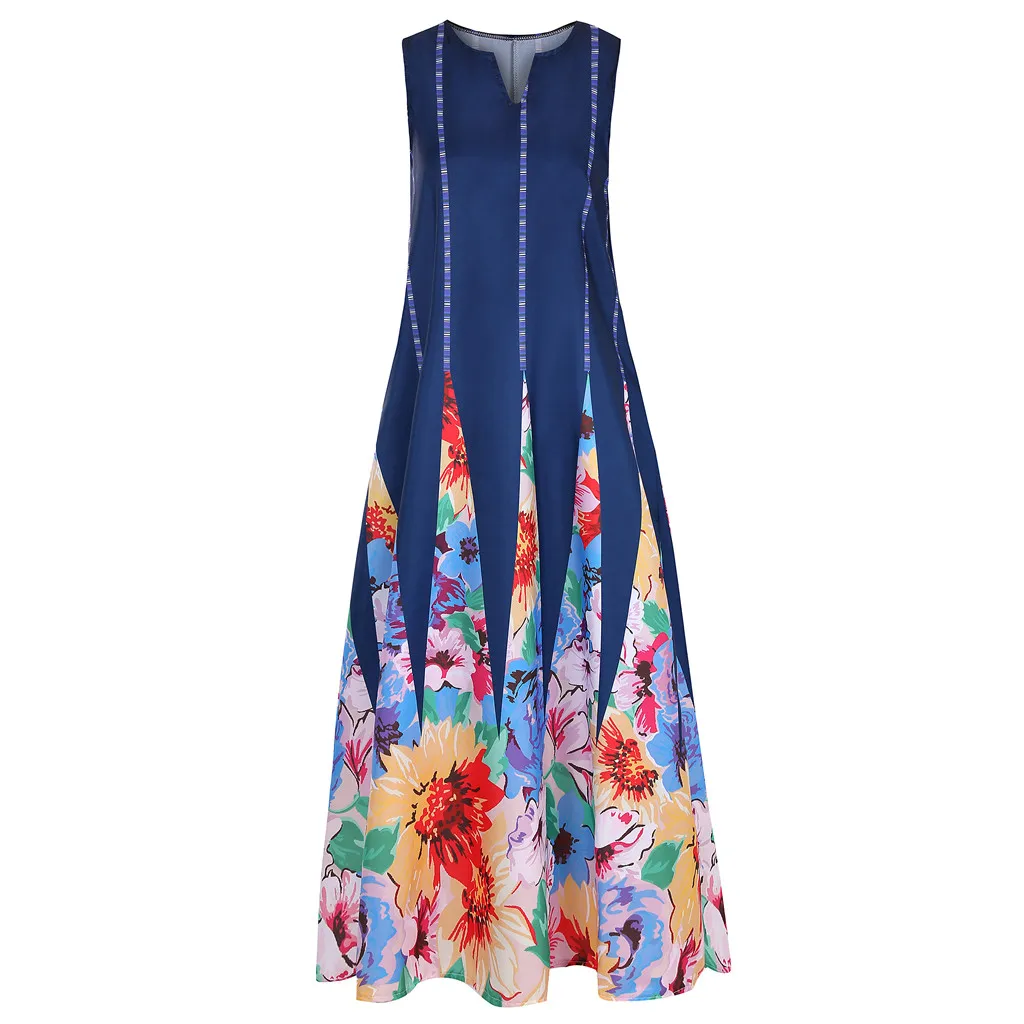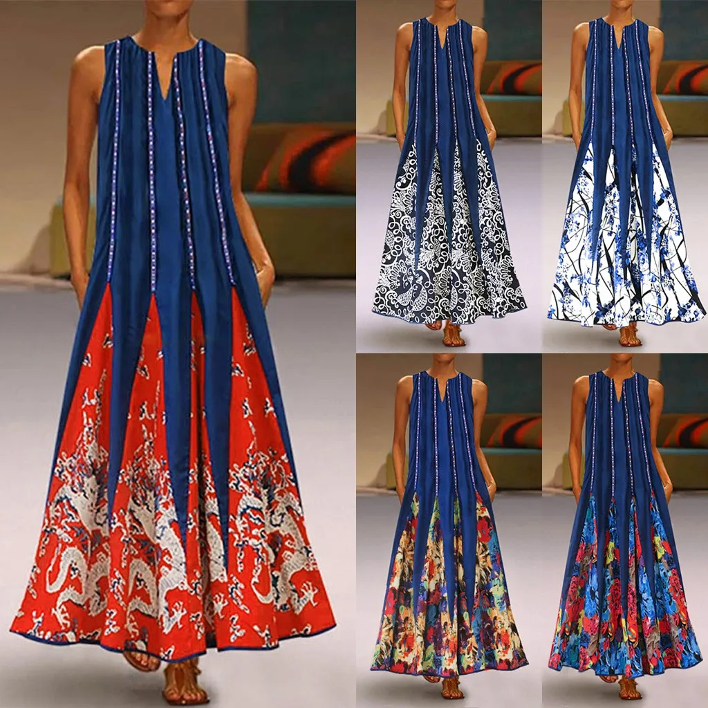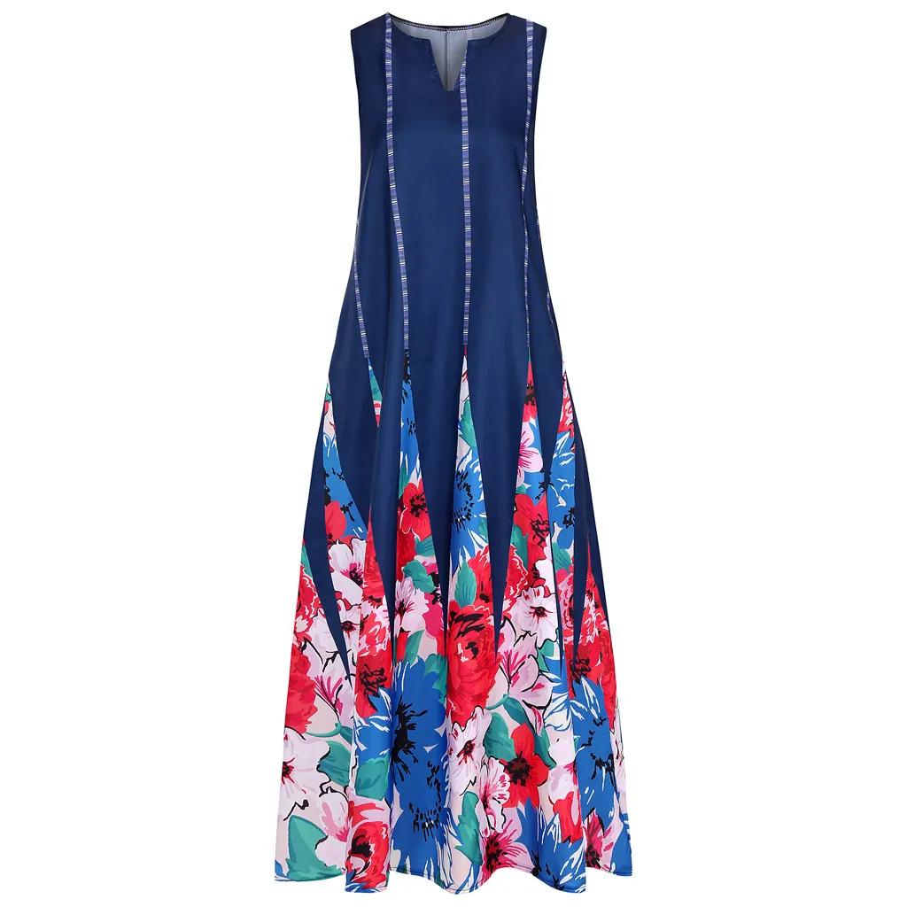 Макси платье для женщин размера плюс, новый сарафан, макси платье для лета в винтажном стиле с v-образным вырезом, богемное пляжное платье-футболка без рукавов