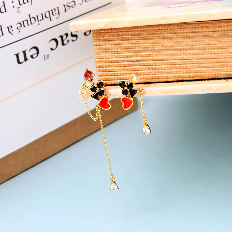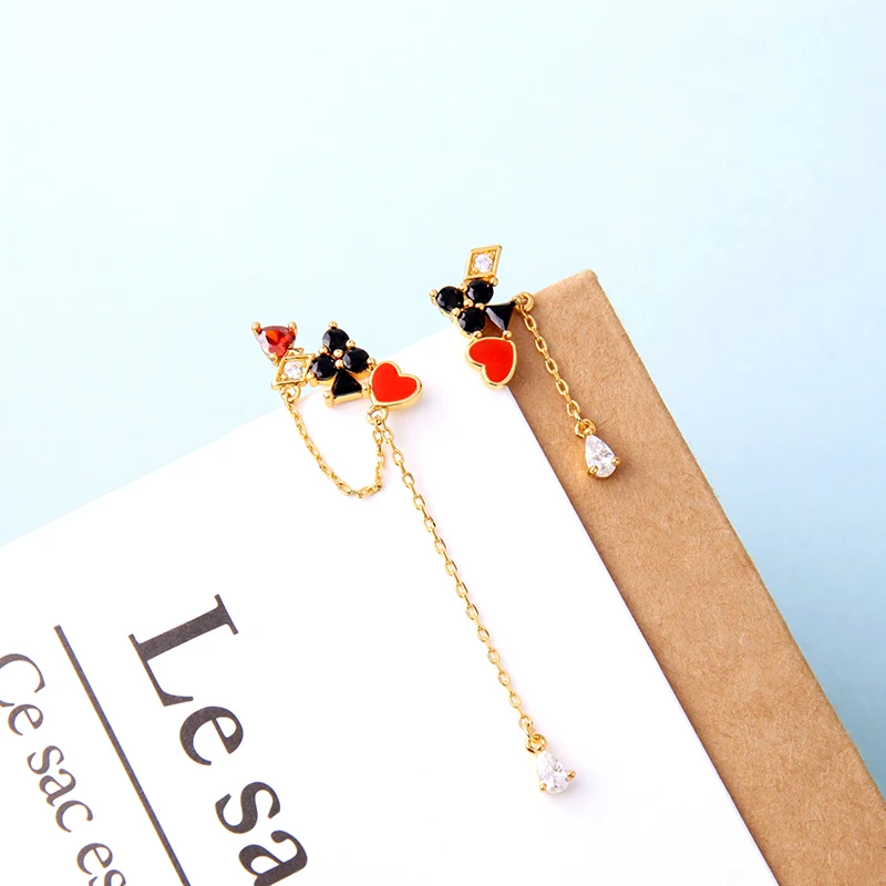Роскошные циркониевые висячие серьги с рисунком в виде покера, Asymetric, золотой цвет, красная эмаль, кисточка, линии для женщин, подарок, модные ювелирные изделия для свиданий