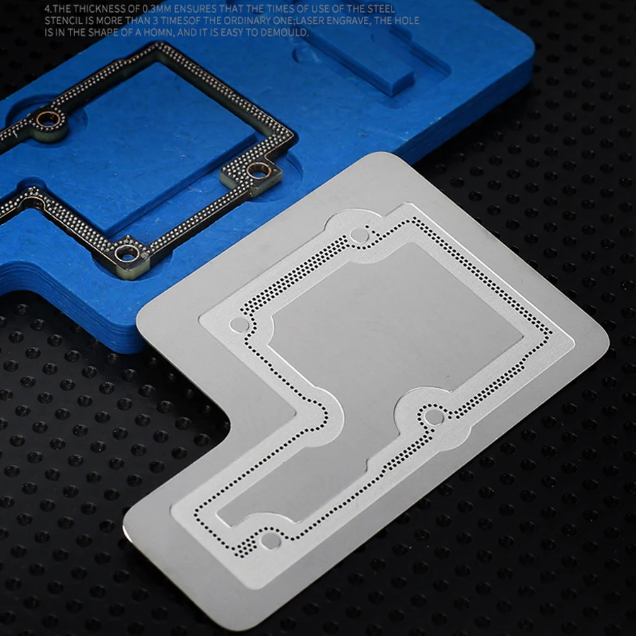 -- Применение высокоскоростной технологии числового управления и высокотемпературного стойкого производства закаленных материалов, круглое квадратное точное отверстие, делает стальную сеть более прочной, легче снимать сеть, более эффективной. -- Легко скребать олово, а толщина стального листа вокруг работы может достигать 0,3 мм, высокая прочность, не легко деформируется при нажатии вручную. -Слот для позиционирования изготовлен из термостойкого синтетического камня.