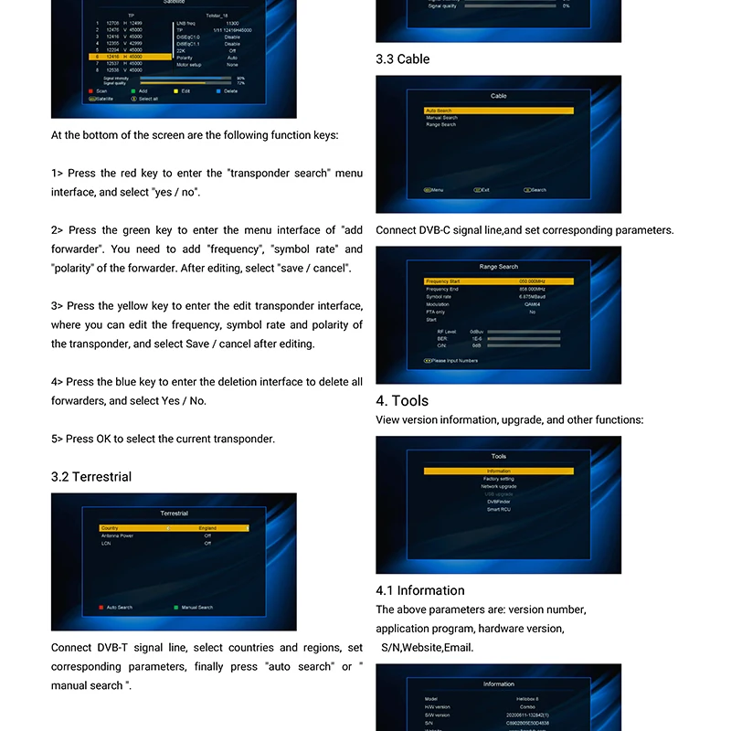 В списке «Спутник» нажмите кнопку «желтый», чтобы войти в меню Интерфейс «списка транспондеров», как показано на следующем рисунке: В нижней части экрана находятся следующие функциональные клавиши: 1> нажмите красную клавишу, чтобы войти в меню «Поиск транспондера» Интерфейс и выберите «да/нет». 2> Нажмите Зеленую клавишу, чтобы войти в меню «Добавить» Экспедитор ". Вам нужно добавить «частоту», «частоту символа» и "Полярность" экспедитора. После редактирования выберите «сохранить/отменить». 3> нажмите желтую клавишу, чтобы войти в интерфейс edit transponder, Где вы можете изменить частоту, частоту символов и полярность Транспондер и выберите Сохранить/отменить после редактирования. 4> нажмите синюю клавишу, чтобы войти в интерфейс удаления, чтобы удалить все Экспедиторов, и выберите Да/Нет. 5> нажмите OK, чтобы выбрать текущий транспондер. 3,2 повторное испытание Подключите сигнальную линию DVB-T, выберите страны и регионы, установите Соответствующие параметры, наконец нажмите «автоматический поиск» или « Ручной поиск ". Кабель: Подключите DVB-C сигнальной линии и установите соответствующие параметры. 4. Информация о версии, обновлении и других функциях: Информация Вышеуказанные параметры: номер версии, Прикладная программа, аппаратная версия, S/N, веб-сайт, электронная почта.