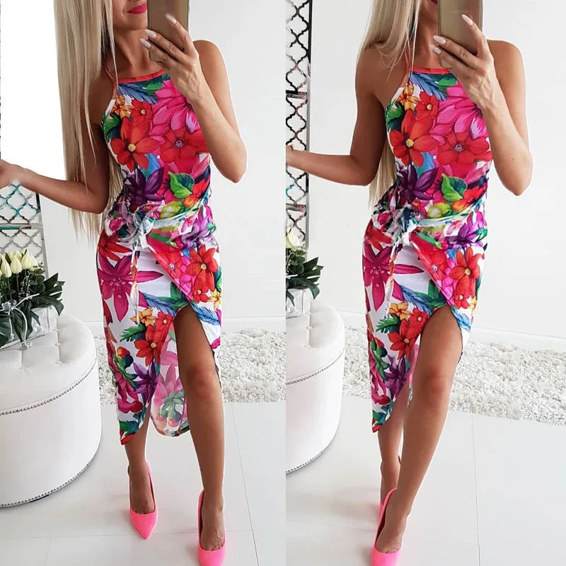 * Описание товара:Женская одежда, летняя сексуальная, тонкая без рукавов, на тонких бретелях, платье с принтом, пляжные вечерние, большие размеры