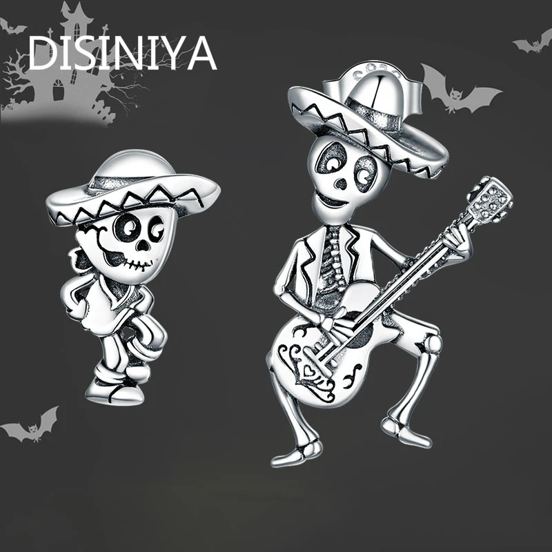Окисленные серебряные серьги-гвоздики для женщин, череп, человек, с гитарой, ювелирное изделие, подарок для девочки, Стерлинговое Серебро 925 пробы, ювелирное изделие, ZBSE00420