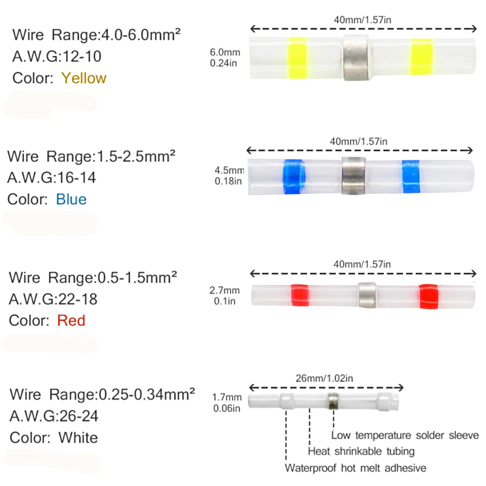 12 x Белые Термоусадочные соединители: Диаметр 5,0 мм кабеля, поперечное сечение 1,5-2.5mm2 16-14AWG