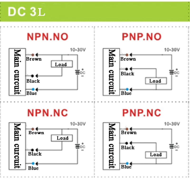 Индуктивный Тип: диффузное отражение; Индукционное расстояние: 30 см регулируется; Рабочее напряжение: DC6-36V • Сила тока: 300mA Длина кабеля: 1 м Рабочая среда: температура от-40 до + 70 градусов Цельсия; Уровень защиты: IP61-IP67; Соответствующего времени: функция сброса времени составляет менее 2,5 мс; Предмет: прозрачный, непрозрачный; Сопротивление изоляции: больше или равен 20 м ом; Примечание: 1. Переключатель питания должен быть подключен, чтобы проверить правильность проводки, проверьте параметры напряжения для номинального значения; 2. Нагрузка переключателя не может быть короткой, нагрузка не должна превышать максимальный выходной ток Разница между PNP NPN NO NC NPN, PNP, нормально открытый (нет) и нормально закрытый (NC): выберите тот, который соответствует вашему требованию, различия выходного типа: Нет и NC означает состояние контактов датчика, когда нет индукции. -Обычно открытый тип: когда датчик приближения не работает (когда объект не ощущается), контакт открывается и закрывается, когда датчик приближения определяет объект. Нормально открытый, выход сигнала выключен в нормальном состоянии. При обнаружении объекта контакт закрыт и сигнал выводится. -Нормально закрытый тип: когда датчик приближения не работает, контакт закрыт и отключен, когда датчик приближения определяет объект. Нормально закрытый, что выход сигнала в нормальном состоянии и сигнал непрерывно выводится, контакт отключен, когда объект ощущается, и выход выключен. NPN: Выходное низкое напряжение, отрицательный сигнал. PNP: Выходное Высокое напряжение, положительный сигнал NPN NO: нормально открытый. Обнаружен предмет, черная линия выводит отрицательное напряжение NPN NC: нормально закрытый. Обнаружен предмет, сбой и выход сигнала Номер PNP: нормально открытый. Обнаружен предмет, черная линия выводит положительное напряжение PNP NC: Нормально закрытый и черный линейный выход с высоким потенциальным сигналом. Обнаружен предмет, кричащий отключен и Выводит сигнал.